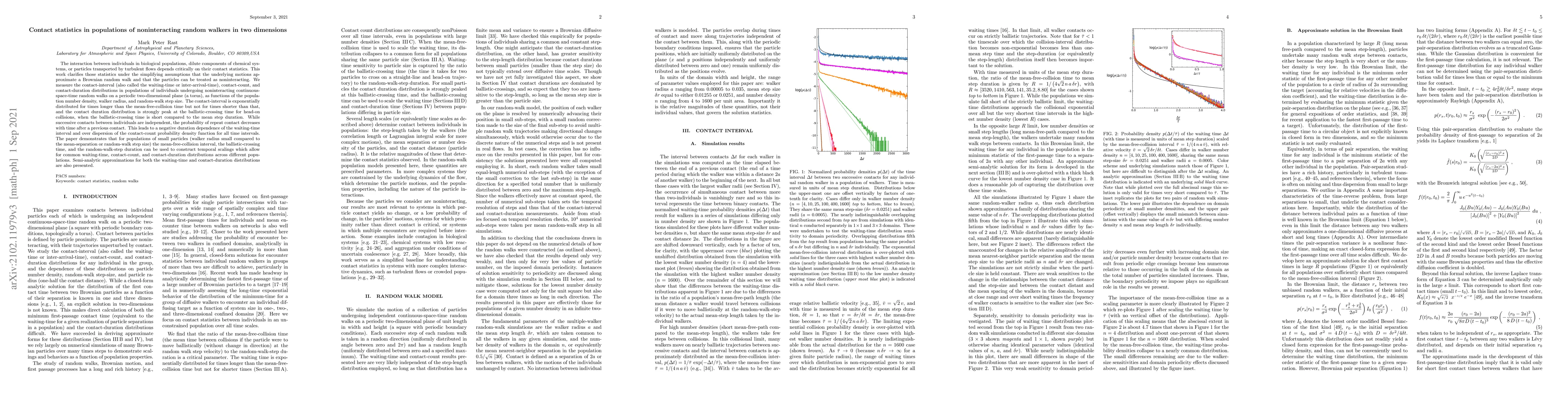 Researchers studied contact statistics in populations of noninteracting random walkers in 2D space, finding that contact intervals are exponentially distributed for long times but not short, and contact durations peak at a specific time for head-on collisions. The findings can be used to construct common distributions across different populations with small particles.