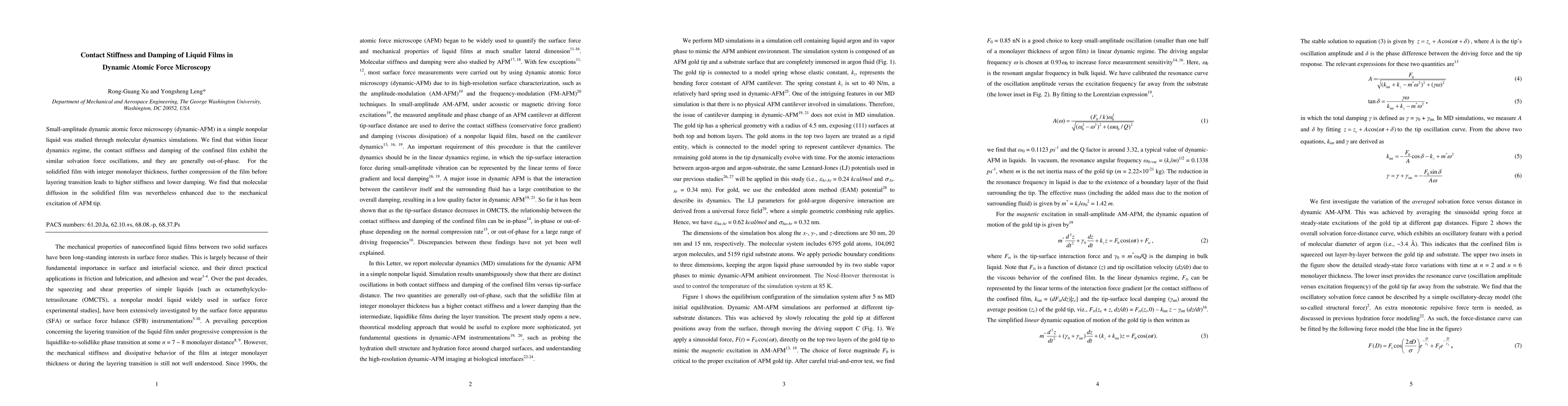 This study uses molecular dynamics simulations to investigate the contact stiffness and damping of liquid films in dynamic atomic force microscopy, revealing that within the linear dynamics regime, these properties exhibit similar solvation force oscillations but are out-of-phase. The research also finds that compressing a solidified film before a layering transition increases stiffness and decreases damping, while the AFM tip's mechanical excitation enhances molecular diffusion in the solidified film.