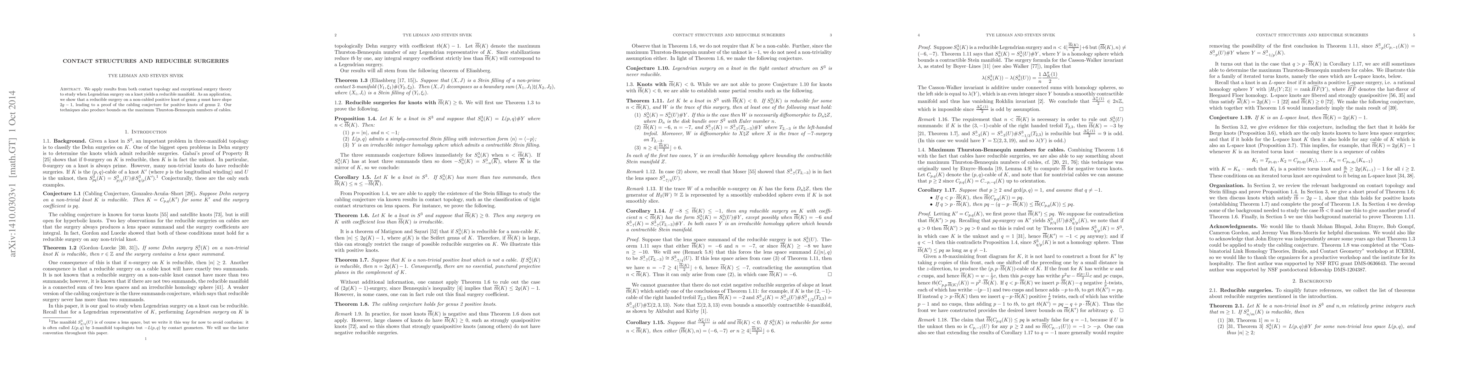 This paper combines contact topology and exceptional surgery theory to explore Legendrian surgeries on knots, proving that reducible surgeries on non-cabled positive knots of genus g must have slope 2g-1, thereby confirming the cabling conjecture for genus 2 positive knots and establishing bounds on the maximum Thurston-Bennequin numbers of cables.