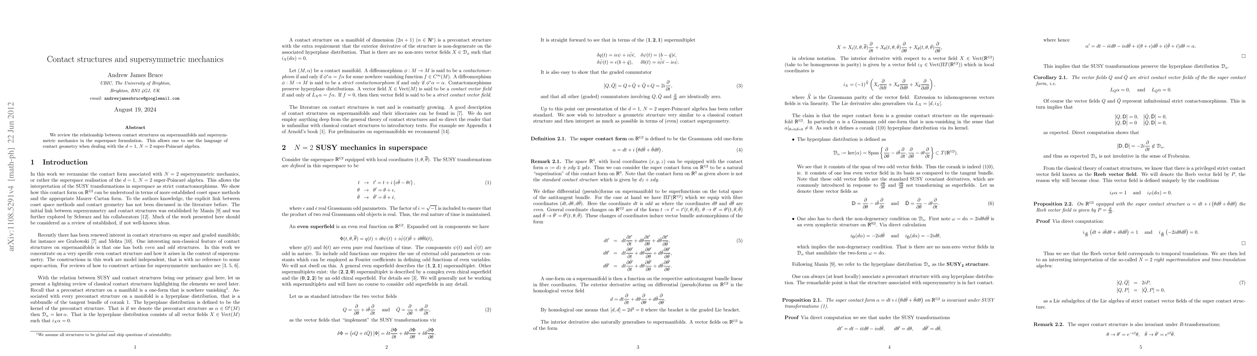 Summary: This paper explores the connection between contact structures on supermanifolds and supersymmetric mechanics within the superspace framework, utilizing contact geometry to address the d = 1, N = 2 super-Poincaré algebra. The study aims to integrate these geometric concepts for a deeper understanding of supersymmetric systems.