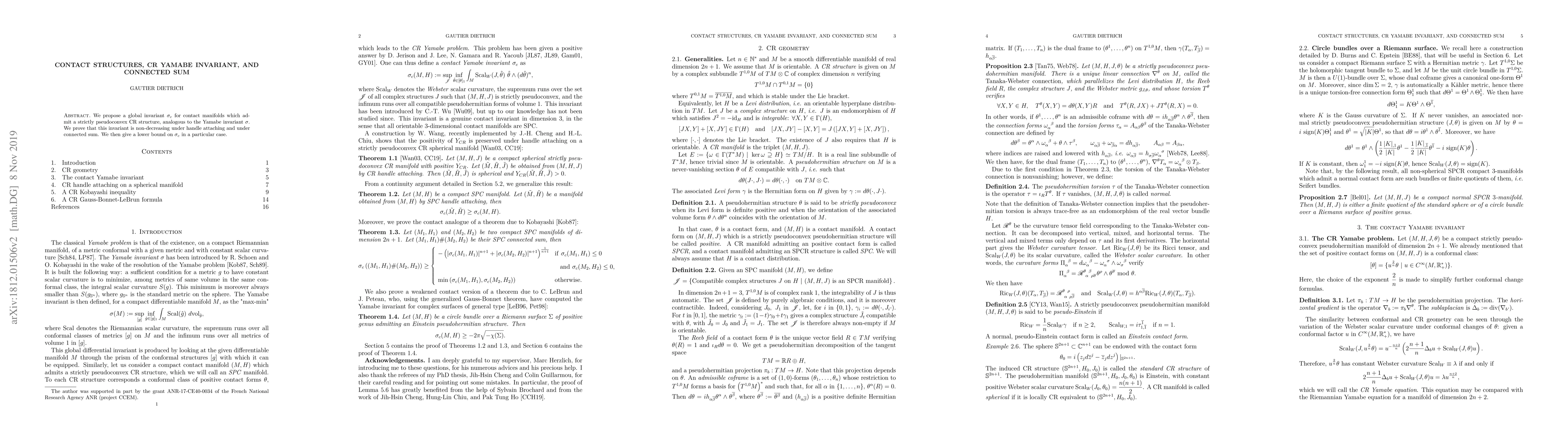 The paper introduces a global invariant $\sigma_c$ for contact manifolds with strictly pseudoconvex CR structures, analogous to the Yamabe invariant, and proves its non-decreasing nature under handle attaching and connected sum operations. It also provides a lower bound for $\sigma_c$ in a specific scenario.