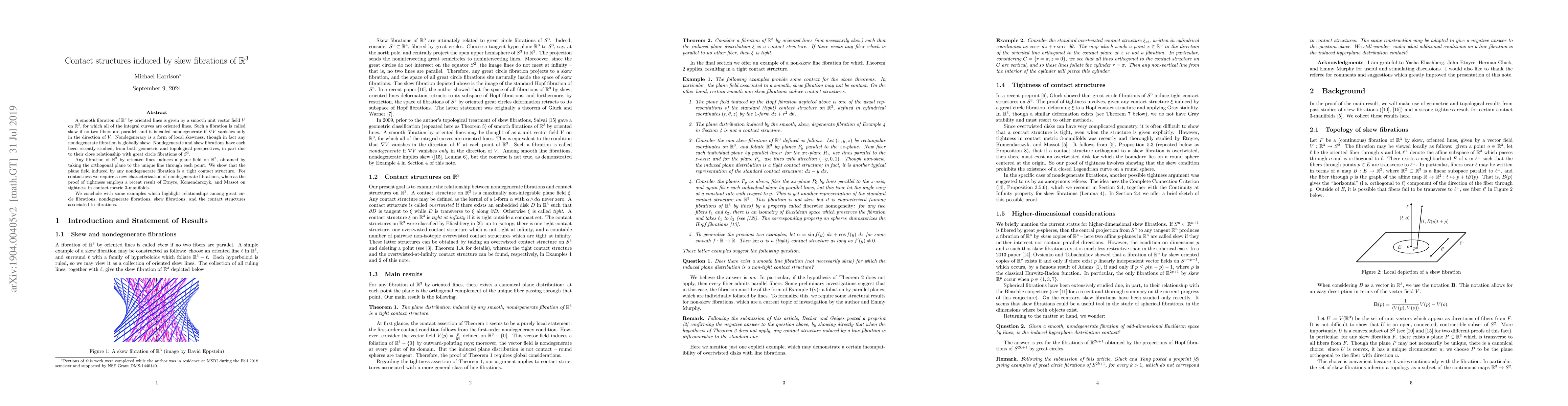 This paper studies skew fibrations of $\mathbb{R}^3$ by oriented lines and shows that the plane field orthogonal to any nondegenerate fibration forms a tight contact structure. It uses a new characterization of nondegenerate fibrations and a result from Etnyre, Komendarczyk, and Massot for proving tightness.