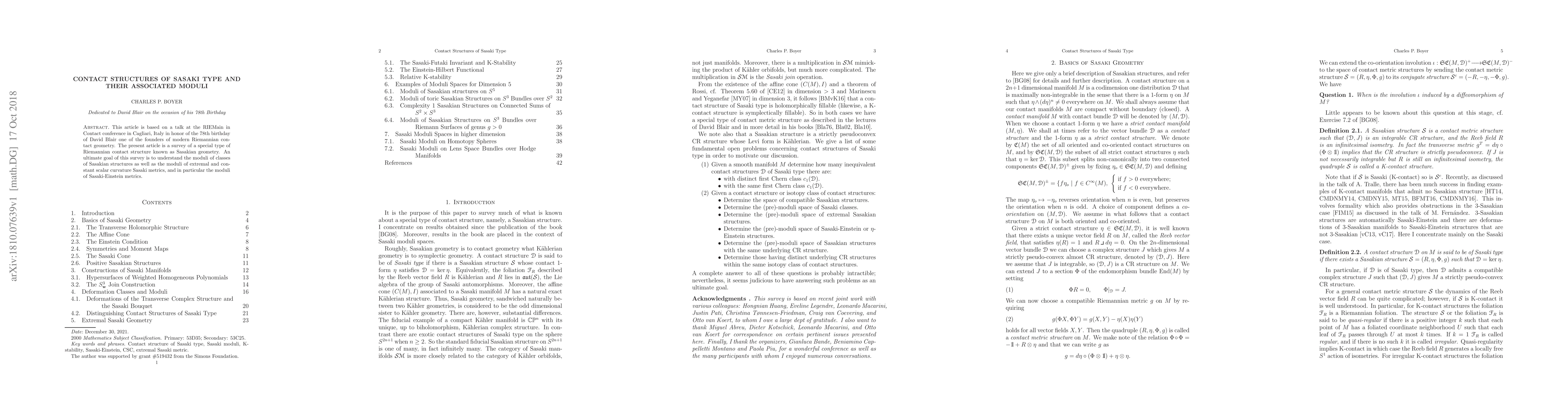 The paper presents a comprehensive survey of Sasakian geometry, including detailed discussions on moduli spaces, deformations, and the Sasaki-Futaki invariant, contributing to the theoretical framework of contact and symplectic geometry.