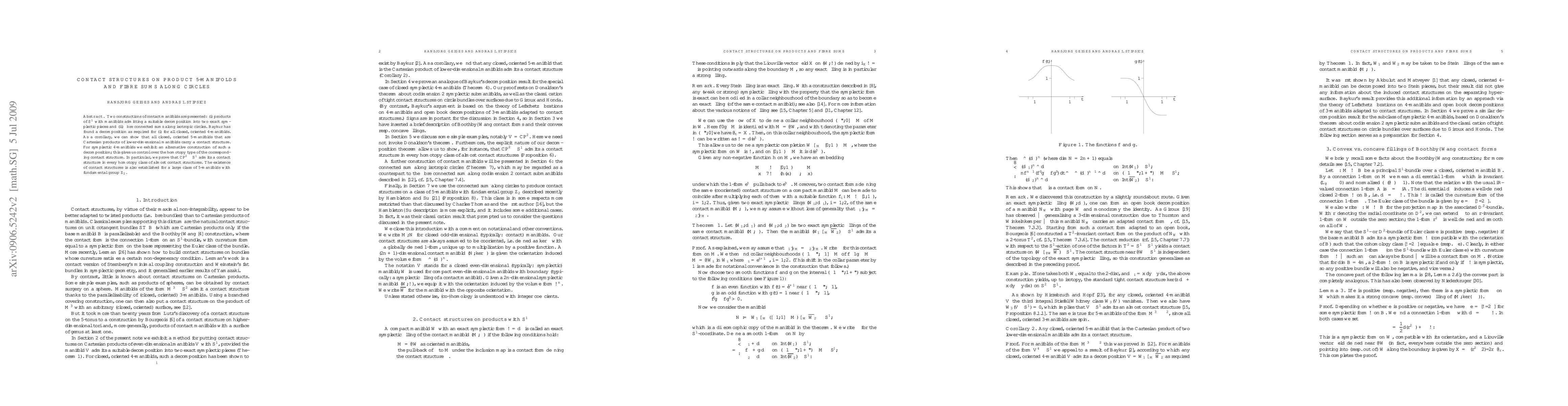Two constructions of contact manifolds are presented: (i) products of S^1 with manifolds admitting a suitable decomposition into two exact symplectic pieces and (ii) fibre connected sums along isotropic circles. Baykur has found a decomposition as required for (i) for all closed, oriented 4-manifolds. As a corollary, we can show that all closed, oriented 5-manifolds that are Cartesian products of lower-dimensional manifolds carry a contact structure. For symplectic 4-manifolds we exhibit an alternative construction of such a decomposition; this gives us control over the homotopy type of the corresponding contact structure. In particular, we prove that CP^2 \times S^1 admits a contact structure in every homotopy class of almost contact structures. The existence of contact structures is also established for a large class of 5-manifolds with fundamental group Z_2.