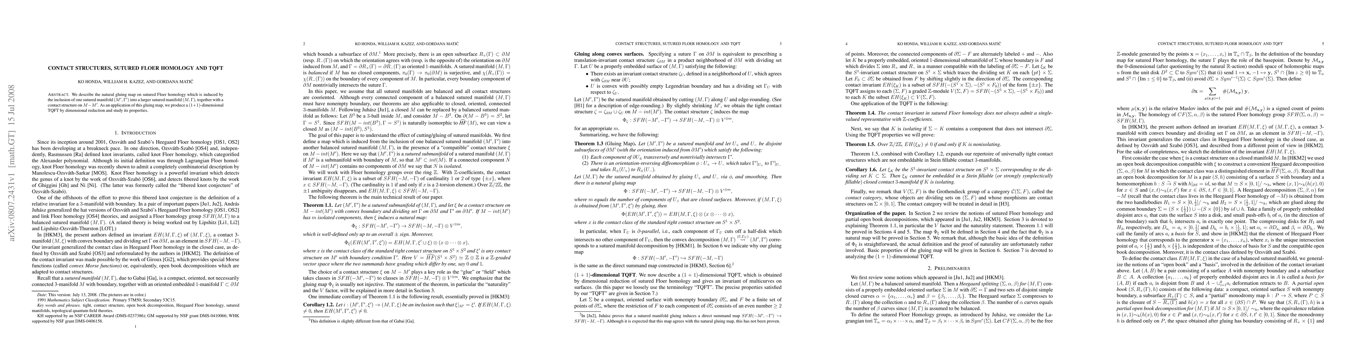 This paper introduces a gluing map for sutured Floer homology arising from the inclusion of one sutured manifold into another, along with a contact structure. It applies this map to construct and analyze a (1+1)-dimensional topological quantum field theory (TQFT) via dimensional reduction.