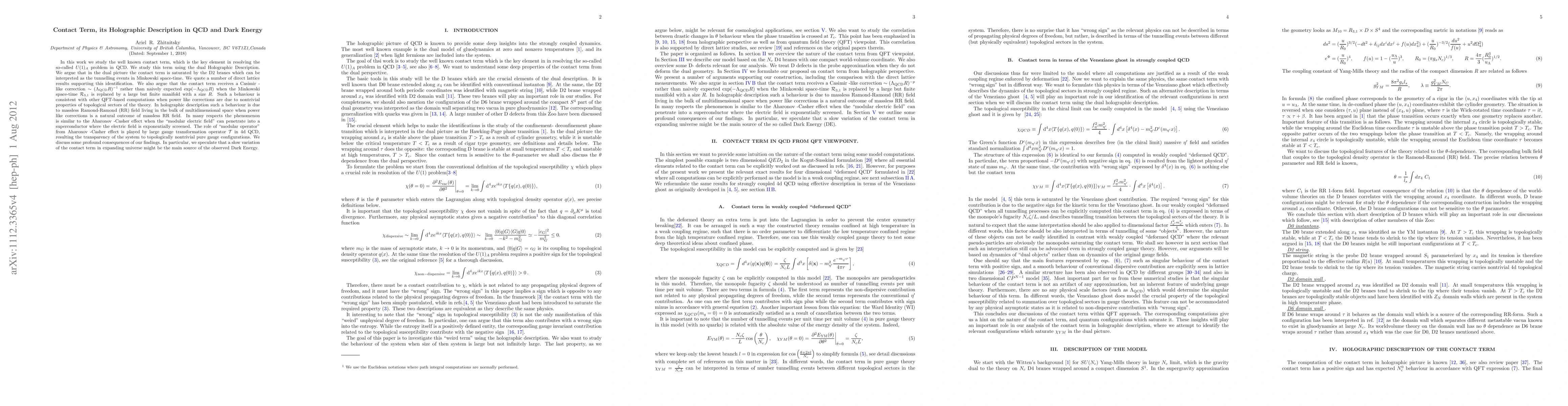 In this work we study the well known contact term, which is the key element in resolving the so-called $U(1)_A$ problem in QCD. We study this term using the dual Holographic Description. We argue that in the dual picture the contact term is saturated by the D2 branes which can be interpreted as the tunnelling events in Minkowski space-time. We quote a number of direct lattice results supporting this identification. We also argue that the contact term receives a Casimir -like correction $\sim (\Lqcd R)^{-1}$ rather than naively expected $\exp(-\Lqcd R)$ when the Minkowski space-time ${\cal R}_{3,1}$ is replaced by a large but finite manifold with a size $R$. Such a behaviour is consistent with other QFT-based computations when power like corrections are due to nontrivial properties of topological sectors of the theory. In holographic description such a behaviour is due to massless Ramond-Ramond (RR) field living in the bulk of multidimensional space when power like corrections is a natural outcome of massless RR field. In many respects the phenomenon is similar to the Aharonov -Casher effect when the "modular electric field" can penetrate into a superconductor where the electric field is exponentially screened. The role of "modular operator" from Aharonov -Casher effect is played by large gauge transformation operator $\cal{T}$ in 4d QCD, resulting the transparency of the system to topologically nontrivial pure gauge configurations. We discuss some profound consequences of our findings. In particular, we speculate that a slow variation of the contact term in expanding universe might be the main source of the observed Dark Energy.