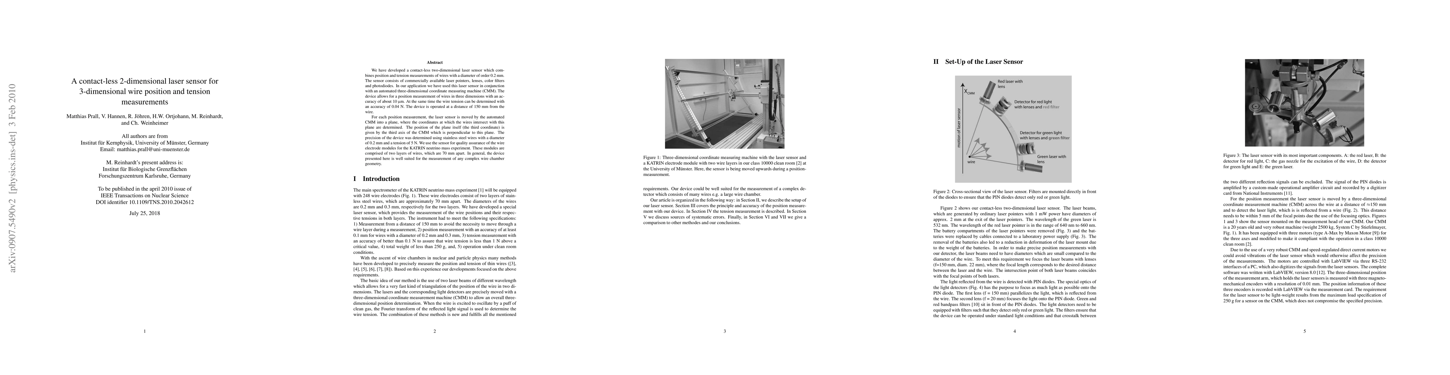 The research presents a contactless 2D laser sensor for precise 3D wire position and tension measurement, achieving accuracy of <10 micrometers and 0.04 N, respectively, at a distance of 15 cm. The sensor, made from commercial components, was tested with wires of 0.2 mm and 0.3 mm diameter, and it's employed for quality assurance in KATRIN neutrino mass experiment modules, with potential applicability in wire chamber geometry measurements.