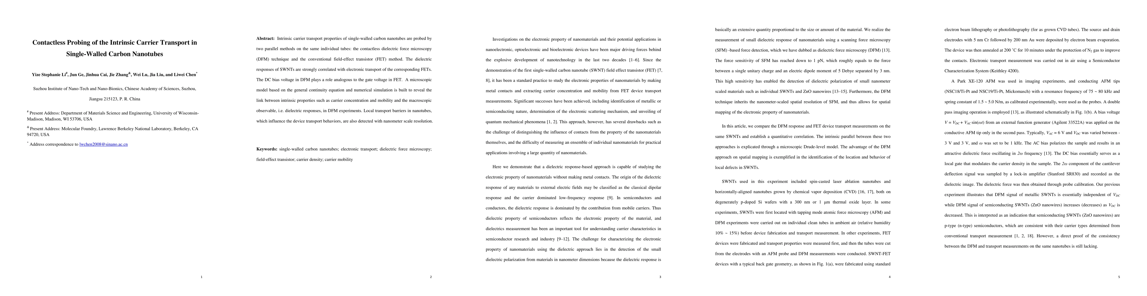 This paper investigates intrinsic carrier transport in single-walled carbon nanotubes using dielectric force microscopy (DFM) and field-effect transistors (FET). The study reveals a strong correlation between dielectric responses in DFM and electronic transport in FETs, providing insights into carrier concentration and mobility.