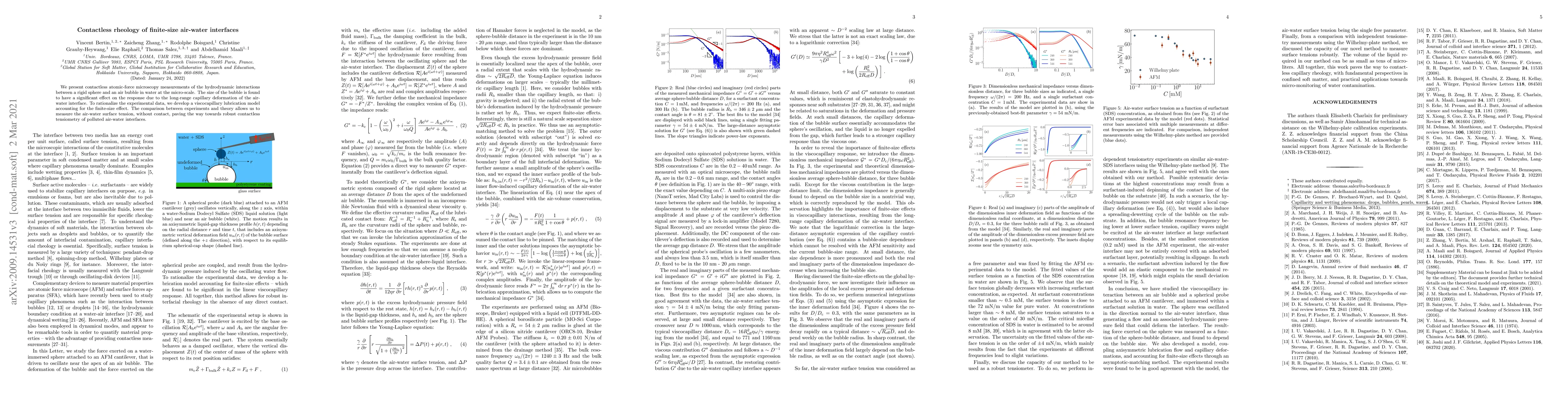 We present contactless atomic-force microscopy measurements of the hydrodynamic interactions between a rigid sphere and an air bubble in water at the micro-scale. The size of the bubble is found to have a significant effect on the response due to the long-range capillary deformation of the air-water interface. To rationalize the experimental data, we develop a viscocapillary lubrication model accounting for the finite-size effect. The comparison between experiments and theory allows us to measure the air-water surface tension, without contact, paving the way towards robust contactless tensiometry of polluted air-water interfaces.