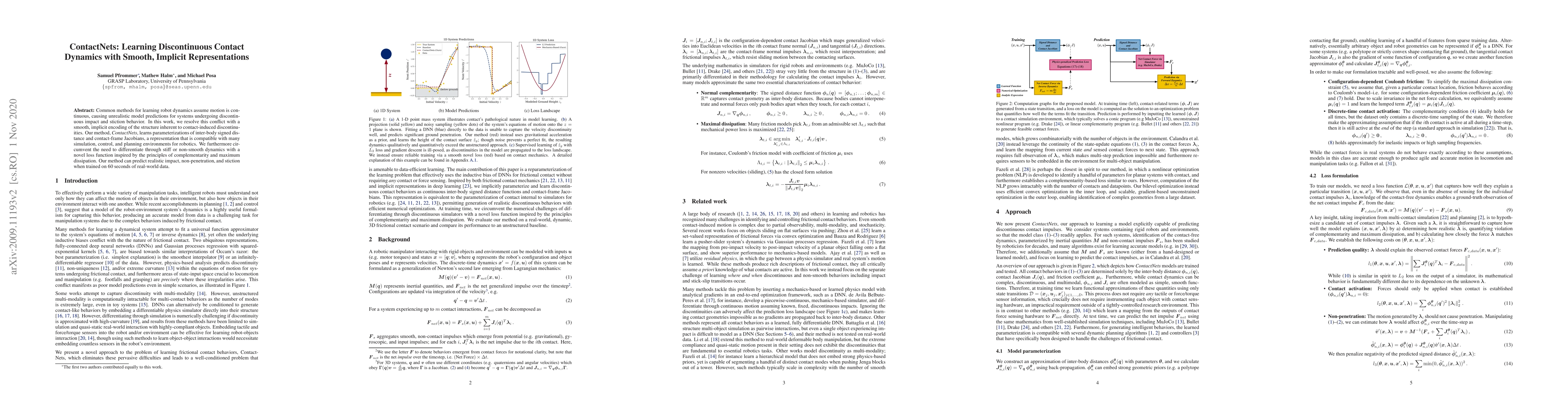 Common methods for learning robot dynamics assume motion is continuous, causing unrealistic model predictions for systems undergoing discontinuous impact and stiction behavior. In this work, we resolve this conflict with a smooth, implicit encoding of the structure inherent to contact-induced discontinuities. Our method, ContactNets, learns parameterizations of inter-body signed distance and contact-frame Jacobians, a representation that is compatible with many simulation, control, and planning environments for robotics. We furthermore circumvent the need to differentiate through stiff or non-smooth dynamics with a novel loss function inspired by the principles of complementarity and maximum dissipation. Our method can predict realistic impact, non-penetration, and stiction when trained on 60 seconds of real-world data.
