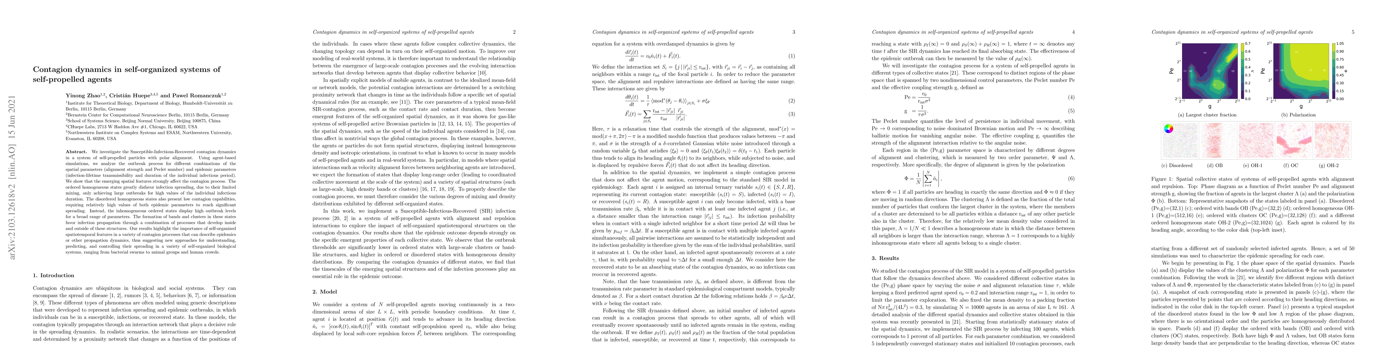 This paper examines how spatial organization in self-propelled agent systems influences contagion dynamics, finding that ordered states limit infection spread while inhomogeneous ordered states facilitate it, highlighting the role of self-organization in controlling contagion spread.