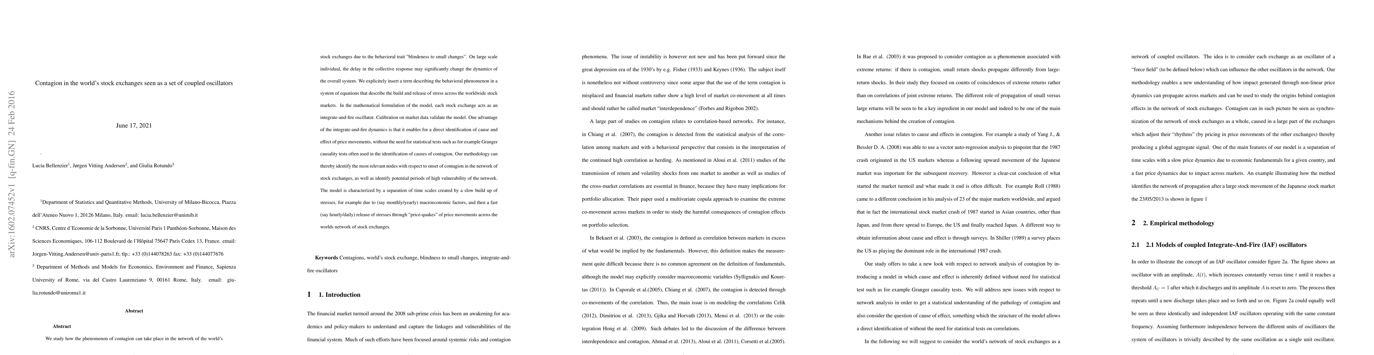 This paper models stock exchange contagion as a network of coupled oscillators, incorporating behavioral "blindness to small changes" to explain delayed collective responses. The integrate-and-fire oscillator model identifies key nodes and periods of high vulnerability, offering a clear cause-and-effect relationship without statistical tests.
