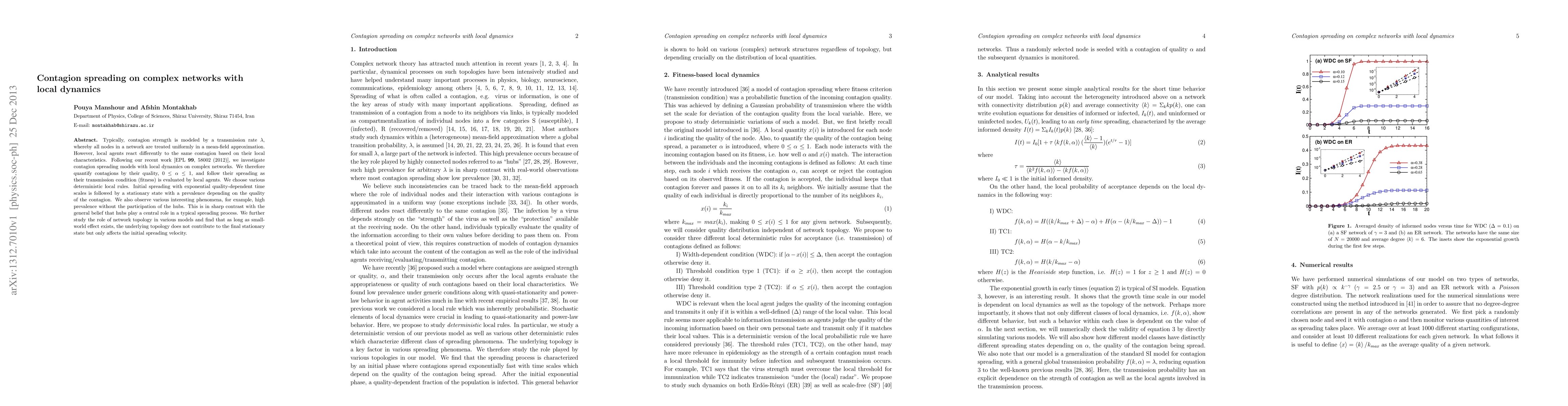 Typically, contagion strength is modeled by a transmission rate $\lambda$, whereby all nodes in a network are treated uniformly in a mean-field approximation. However, local agents react differently to the same contagion based on their local characteristics. Following our recent work [EPL \textbf{99}, 58002 (2012)], we investigate contagion spreading models with local dynamics on complex networks. We therefore quantify contagions by their quality, $0 \leq \alpha \leq 1$, and follow their spreading as their transmission condition (fitness) is evaluated by local agents. We choose various deterministic local rules. Initial spreading with exponential quality-dependent time scales is followed by a stationary state with a prevalence depending on the quality of the contagion. We also observe various interesting phenomena, for example, high prevalence without the participation of the hubs. This is in sharp contrast with the general belief that hubs play a central role in a typical spreading process. We further study the role of network topology in various models and find that as long as small-world effect exists, the underlying topology does not contribute to the final stationary state but only affects the initial spreading velocity.