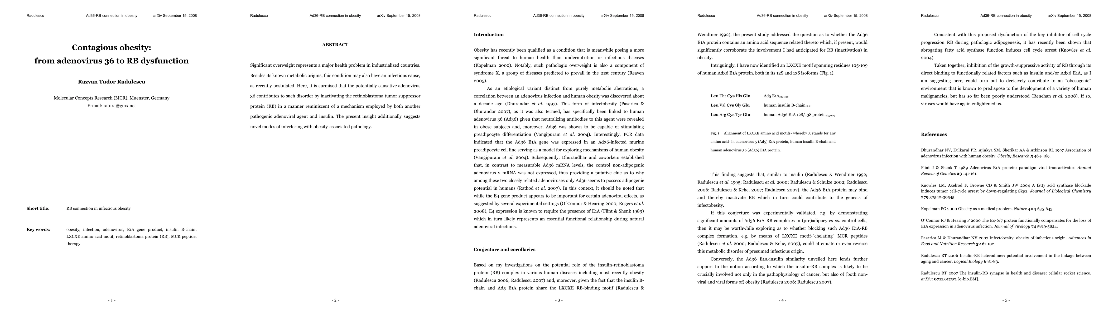 Significant overweight represents a major health problem in industrialized countries. Besides its known metabolic origins, this condition may also have an infectious cause, as recently postulated. Here, it is surmised that the potentially causative adenovirus 36 contributes to such disorder by inactivating the retinoblastoma tumor suppressor protein (RB) in a manner reminiscent of a mechanism employed by both another pathogenic adenoviral agent and insulin. The present insight additionally suggests novel modes of interfering with obesity-associated pathology.
