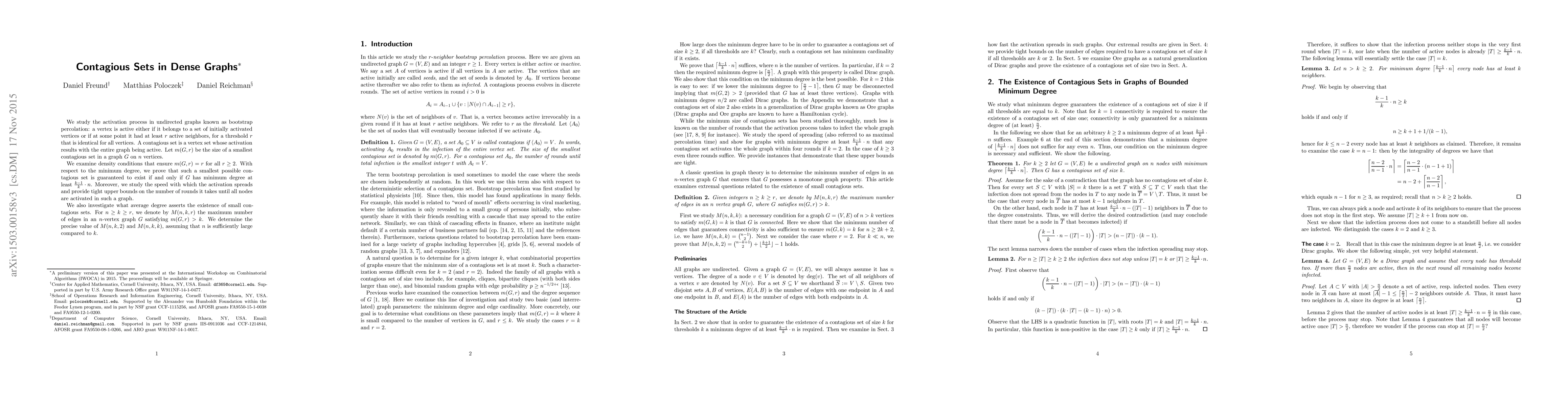We study the activation process in undirected graphs known as bootstrap percolation: a vertex is active either if it belongs to a set of initially activated vertices or if at some point it had at least r active neighbors, for a threshold r that is identical for all vertices. A contagious set is a vertex set whose activation results with the entire graph being active. Let m(G,r) be the size of a smallest contagious set in a graph G on n vertices. We examine density conditions that ensure m(G,r) = r for all r >= 2. With respect to the minimum degree, we prove that such a smallest possible contagious set is guaranteed to exist if and only if G has minimum degree at least (k-1)/k * n. Moreover, we study the speed with which the activation spreads and provide tight upper bounds on the number of rounds it takes until all nodes are activated in such a graph. We also investigate what average degree asserts the existence of small contagious sets. For n >= k >= r, we denote by M(n,k,r) the maximum number of edges in an n-vertex graph G satisfying m(G,r)>k. We determine the precise value of M(n,k,2) and M(n,k,k), assuming that n is sufficiently large compared to k.