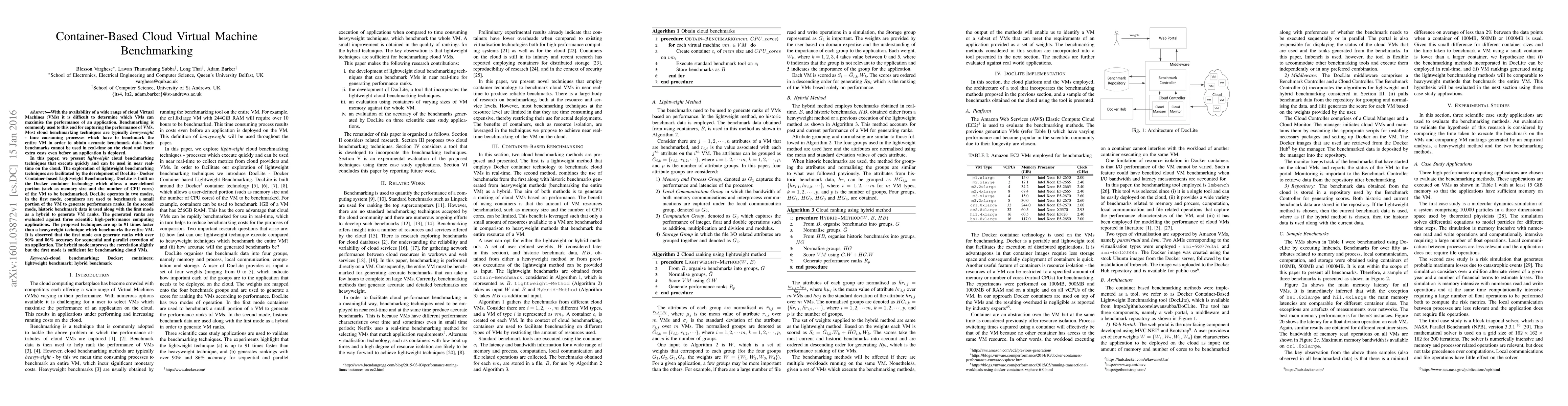 With the availability of a wide range of cloud Virtual Machines (VMs) it is difficult to determine which VMs can maximise the performance of an application. Benchmarking is commonly used to this end for capturing the performance of VMs. Most cloud benchmarking techniques are typically heavyweight - time consuming processes which have to benchmark the entire VM in order to obtain accurate benchmark data. Such benchmarks cannot be used in real-time on the cloud and incur extra costs even before an application is deployed. In this paper, we present lightweight cloud benchmarking techniques that execute quickly and can be used in near real-time on the cloud. The exploration of lightweight benchmarking techniques are facilitated by the development of DocLite - Docker Container-based Lightweight Benchmarking. DocLite is built on the Docker container technology which allows a user-defined portion (such as memory size and the number of CPU cores) of the VM to be benchmarked. DocLite operates in two modes, in the first mode, containers are used to benchmark a small portion of the VM to generate performance ranks. In the second mode, historic benchmark data is used along with the first mode as a hybrid to generate VM ranks. The generated ranks are evaluated against three scientific high-performance computing applications. The proposed techniques are up to 91 times faster than a heavyweight technique which benchmarks the entire VM. It is observed that the first mode can generate ranks with over 90% and 86% accuracy for sequential and parallel execution of an application. The hybrid mode improves the correlation slightly but the first mode is sufficient for benchmarking cloud VMs.
