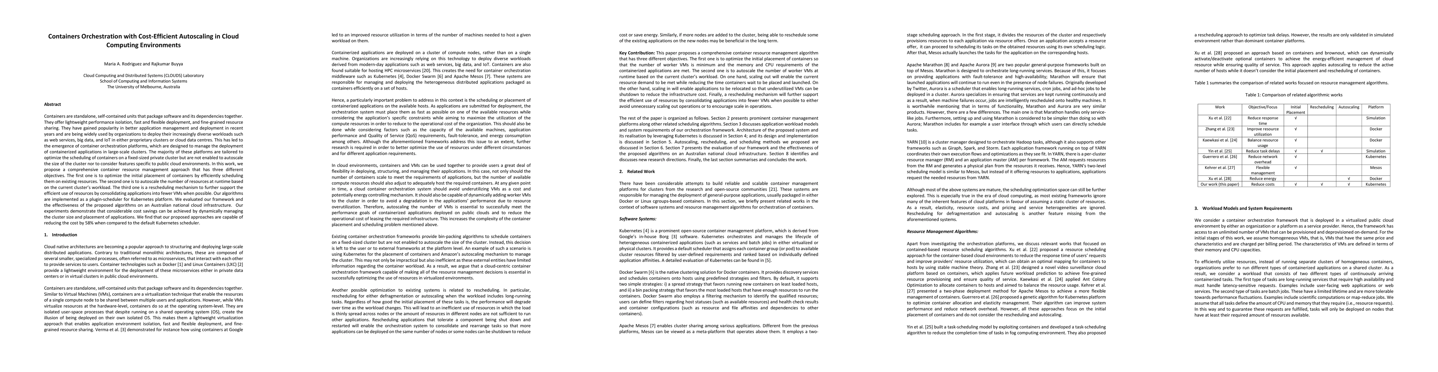 This paper proposes a cost-efficient container orchestration approach for cloud environments, focusing on optimizing initial container placement, autoscaling cluster resources based on workload, and a rescheduling mechanism for resource consolidation. Experiments on an Australian national cloud infrastructure show a 58% reduction in cost compared to the default Kubernetes scheduler.
