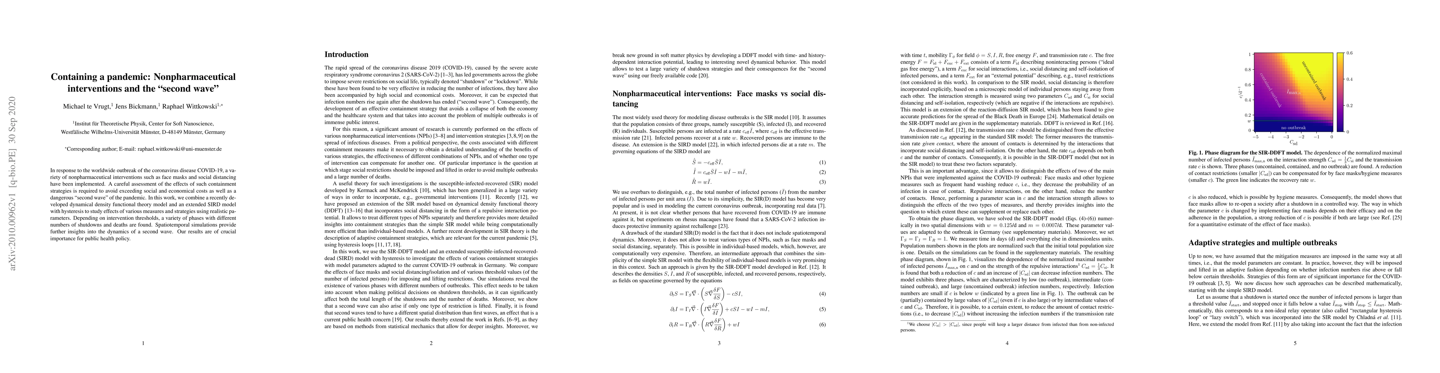In response to the worldwide outbreak of the coronavirus disease COVID-19, a variety of nonpharmaceutical interventions such as face masks and social distancing have been implemented. A careful assessment of the effects of such containment strategies is required to avoid exceeding social and economical costs as well as a dangerous "second wave" of the pandemic. In this work, we combine a recently developed dynamical density functional theory model and an extended SIRD model with hysteresis to study effects of various measures and strategies using realistic parameters. Depending on intervention thresholds, a variety of phases with different numbers of shutdowns and deaths are found. Spatiotemporal simulations provide further insights into the dynamics of a second wave. Our results are of crucial importance for public health policy.