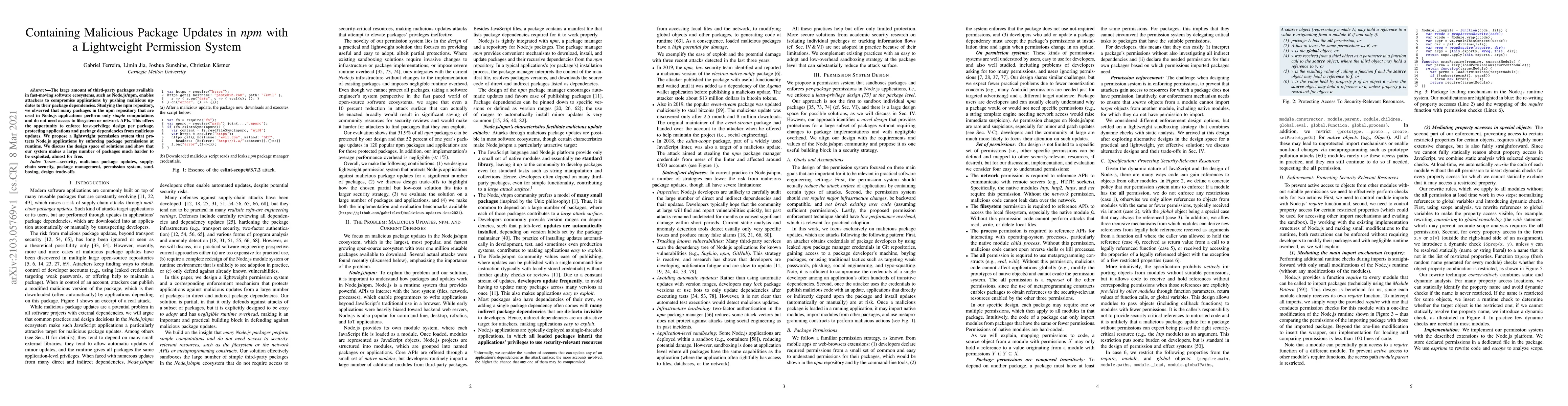 This paper proposes a lightweight permission system to contain malicious package updates in npm by enforcing least-privilege design for Node.js packages. The system aims to protect applications by restricting package access to only necessary APIs, thereby significantly reducing the risk of exploitation.