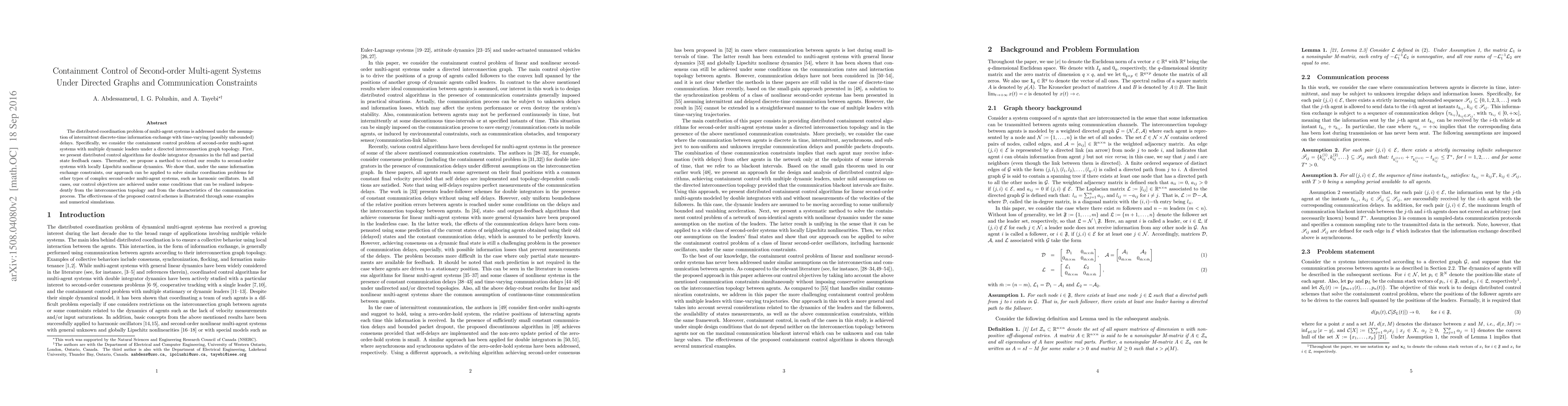 The distributed coordination problem of multi-agent systems is addressed in this paper under the assumption of intermittent communication between agents in the presence of time-varying communication delays. Specifically, we consider the containment control problem of second-order multi-agent systems with multiple dynamic leaders under a directed interconnection graph topology. Also, communication between agents is performed only at some discrete instants of time in the presence of irregular communication delays and packet dropout. First, we present distributed control algorithms for double integrator dynamics in the full and partial state feedback cases. Then, we propose a method to extend our results to second-order systems with locally Lipschitz nonlinear dynamics. In both cases, we show that the proposed approach leads to our control objectives under sufficient conditions relating the characteristics of the communication process and the control gains. We also show that our approach can be applied to solve various similar coordination problems in multi-agent systems under the same communication constraints. The effectiveness of the proposed control schemes is illustrated through some examples and numerical simulations.