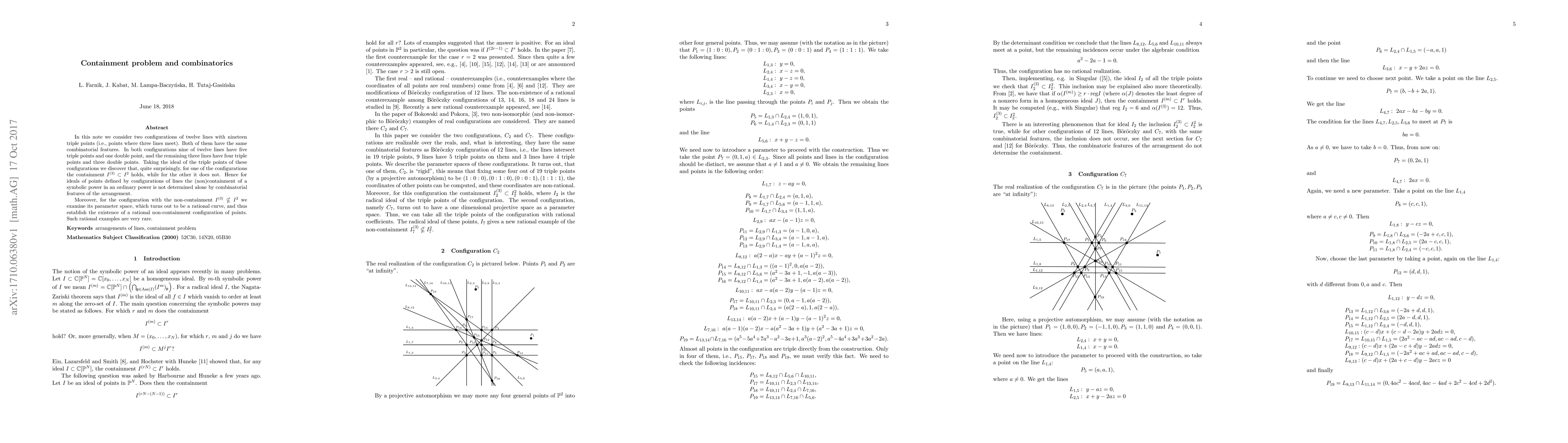 In this note we consider two configurations of twelve lines with nineteen triple points (i.e., points where three lines meet). Both of them have the same combinatorial features. In both configurations nine of twelve lines have five triple points and one double point, and the remaining three lines have four triple points and three double points. Taking the ideal of the triple points of these configurations we discover that, quite surprisingly, for one of the configurations the containment $I^{(3)} \subset I^2$ holds, while for the other it does not. Hence for ideals of points defined by configurations of lines the (non)containment of a symbolic power in an ordinary power is not determined alone by combinatorial features of the arrangement. Moreover, for the configuration with the non-containment $I^{(3)} \nsubseteq I^2$ we examine its parameter space, which turns out to be a rational curve, and thus establish the existence of a rational non-containment configuration of points. Such rational examples are very rare.