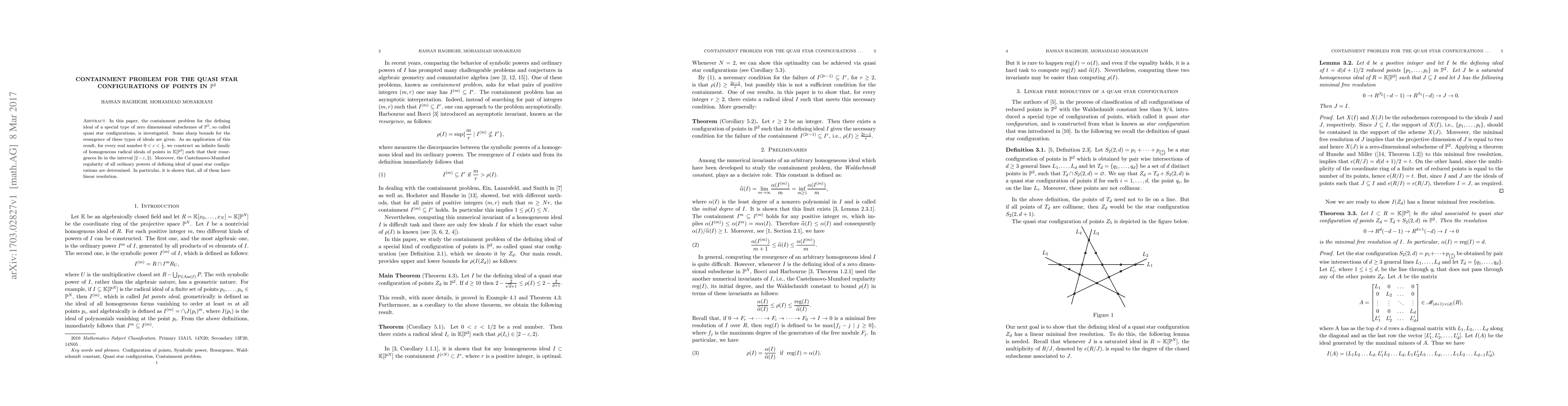 In this paper, the containment problem for the defining ideal of a special type of zero dimensional subschemes of $\mathbb{P}^2$, so called quasi star configurations, is investigated. Some sharp bounds for the resurgence of these types of ideals are given. As an application of this result, for every real number $0 < \varepsilon < \frac{1}{2}$, we construct an infinite family of homogeneous radical ideals of points in $\mathbb{K}[\mathbb{P}^2]$ such that their resurgences lie in the interval $[2- \varepsilon ,2)$. Moreover, the Castelnuovo-Mumford regularity of all ordinary powers of defining ideal of quasi star configurations are determined. In particular, it is shown that, %the defining ideal of a quasi star configuration, and all of them have linear resolution.
