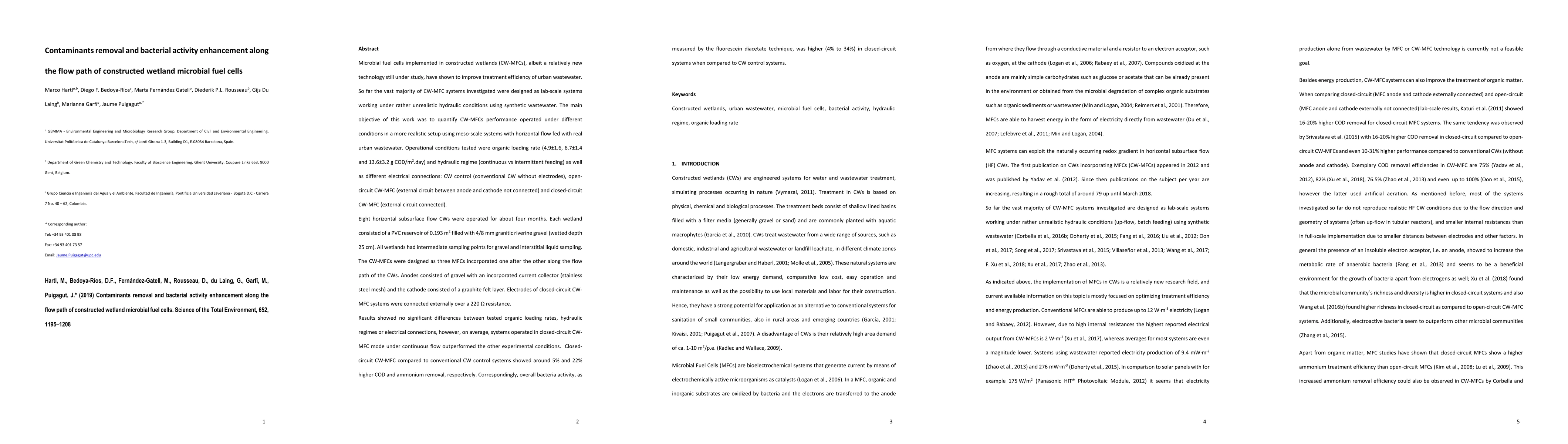 This study evaluates the performance of constructed wetland microbial fuel cells (CW-MFCs) in a meso-scale setup with real urban wastewater, finding that closed-circuit CW-MFCs under continuous flow significantly enhance contaminants removal and bacterial activity compared to conventional CW systems.