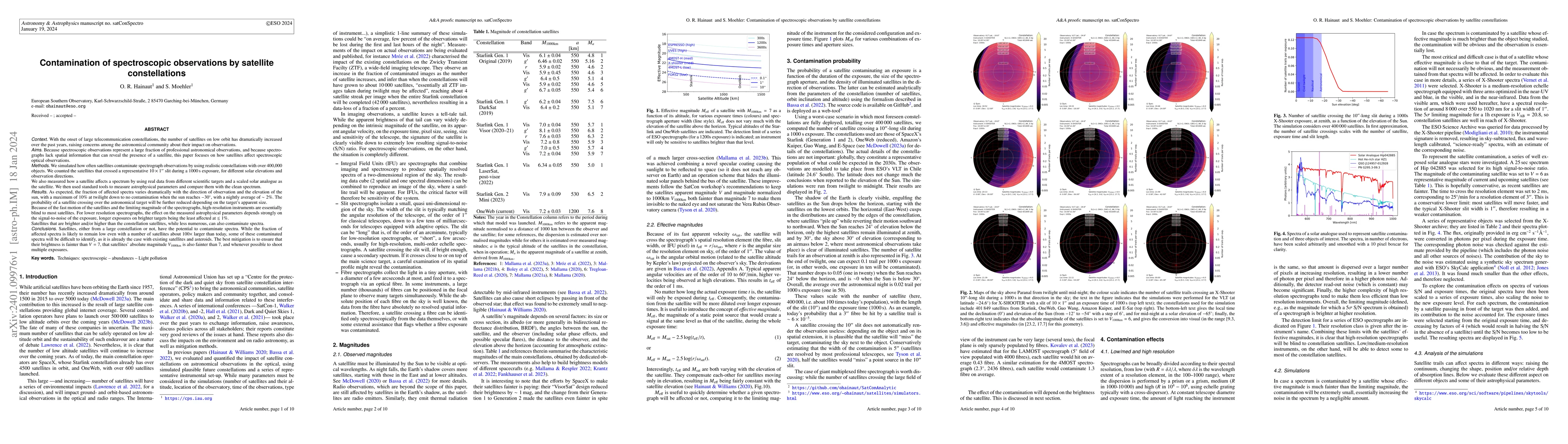 This study investigates the impact of increasing satellite constellations on spectroscopic observations, finding that while high-resolution spectrographs are largely unaffected, lower resolution instruments can experience contamination, especially at twilight. Mitigation strategies include ensuring satellites are fainter than V=7 and taking multiple exposures to identify contamination.