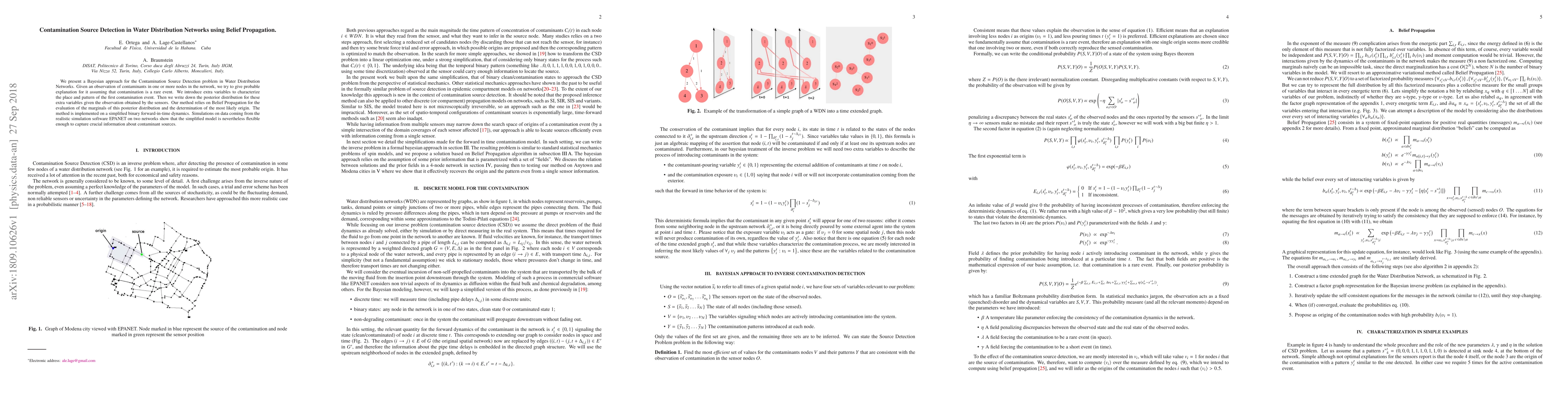 This paper proposes a Bayesian method for detecting contamination sources in water distribution networks using belief propagation. The approach identifies probable contamination origins by modeling the first contamination event and evaluating its posterior distribution, demonstrating effectiveness through simulations on EPANET-generated data.