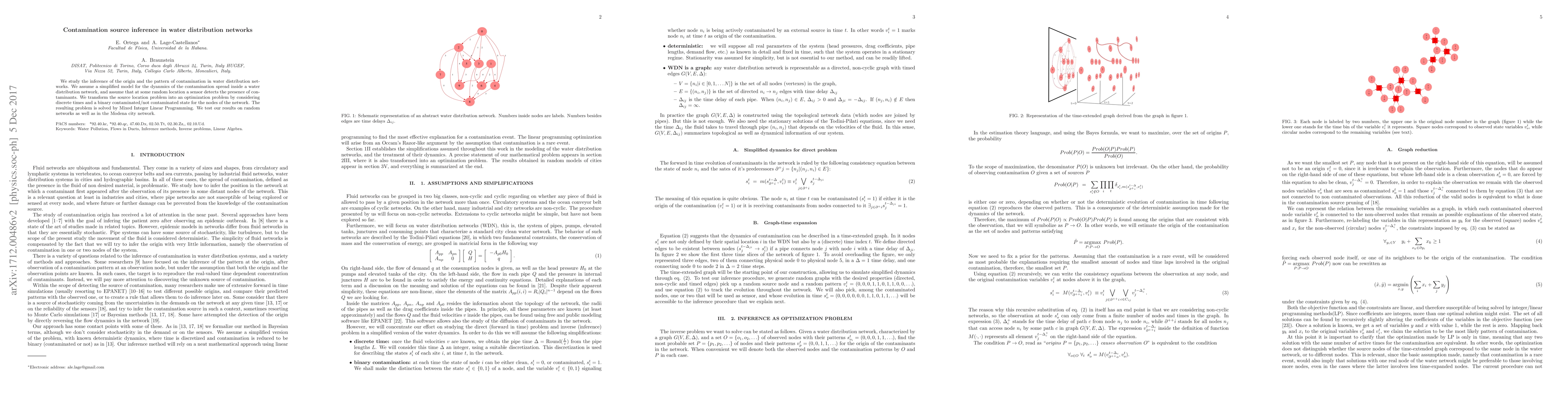 We study the inference of the origin and the pattern of contamination in water distribution networks. We assume a simplified model for the dyanmics of the contamination spread inside a water distribution network, and assume that at some random location a sensor detects the presence of contaminants. We transform the source location problem into an optimization problem by considering discrete times and a binary contaminated/not contaminated state for the nodes of the network. The resulting problem is solved by Mixed Integer Linear Programming. We test our results on random networks as well as in the Modena city network.
