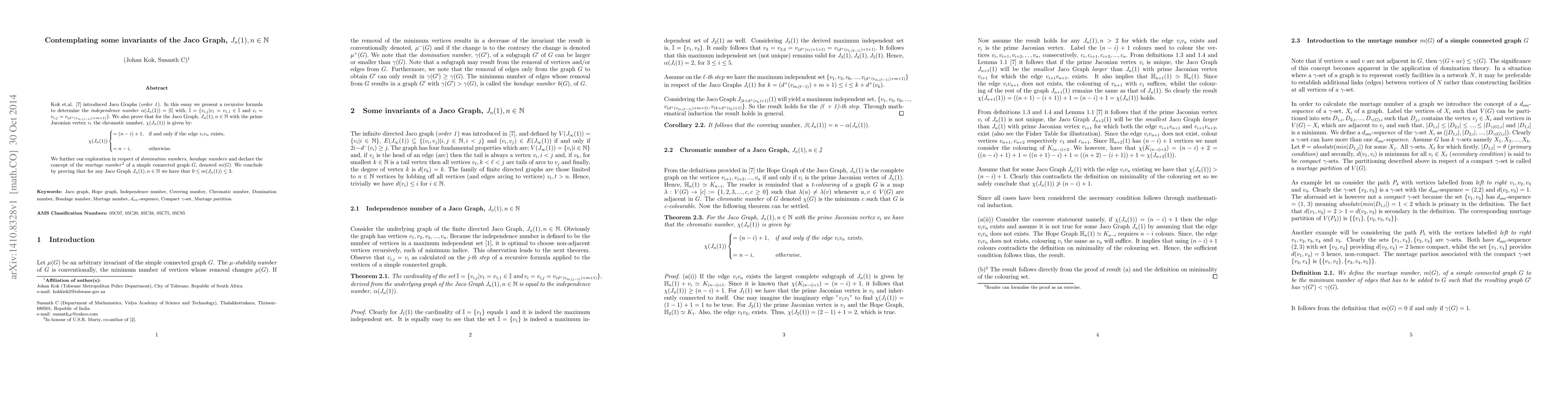This paper introduces a recursive formula to determine the independence number of Jaco Graphs $J_n(1)$ and proves the chromatic number for these graphs based on the existence of a specific edge. It also explores domination numbers, bondage numbers, and introduces the murtage number, proving that $0 \leq m(J_n(1)) \leq 3$ for any Jaco Graph $J_n(1)$.