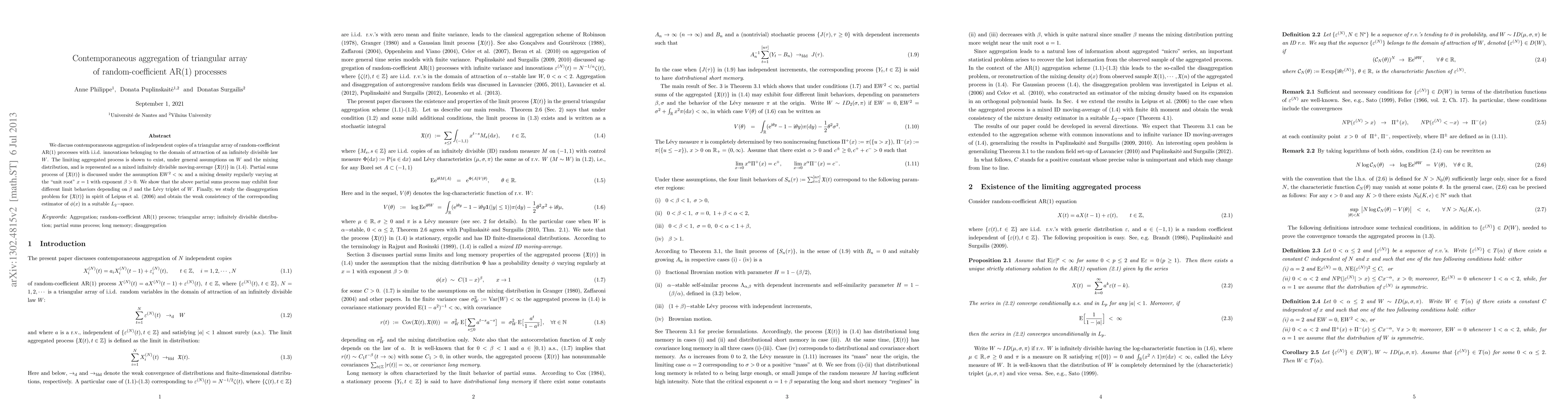 We discuss contemporaneous aggregation of independent copies of a triangular array of random-coefficient AR(1) processes with i.i.d. innovations belonging to the domain of attraction of an infinitely divisible law W. The limiting aggregated process is shown to exist, under general assumptions on W and the mixing distribution, and is represented as a mixed infinitely divisible moving-average. Partial sums process of $ is discussed under the assumption E(W^2) is finite and a mixing density regularly varying at the "unit root" x=1 with exponent \beta >0. We show that the above partial sums process may exhibit four different limit behaviors depending on \beta and the L\'evy triplet of W. Finally, we study the disaggregation problem in spirit of Leipus et al. (2006) and obtain the weak consistency of the corresponding estimator of the mixing distribution in a suitable L_2-space.