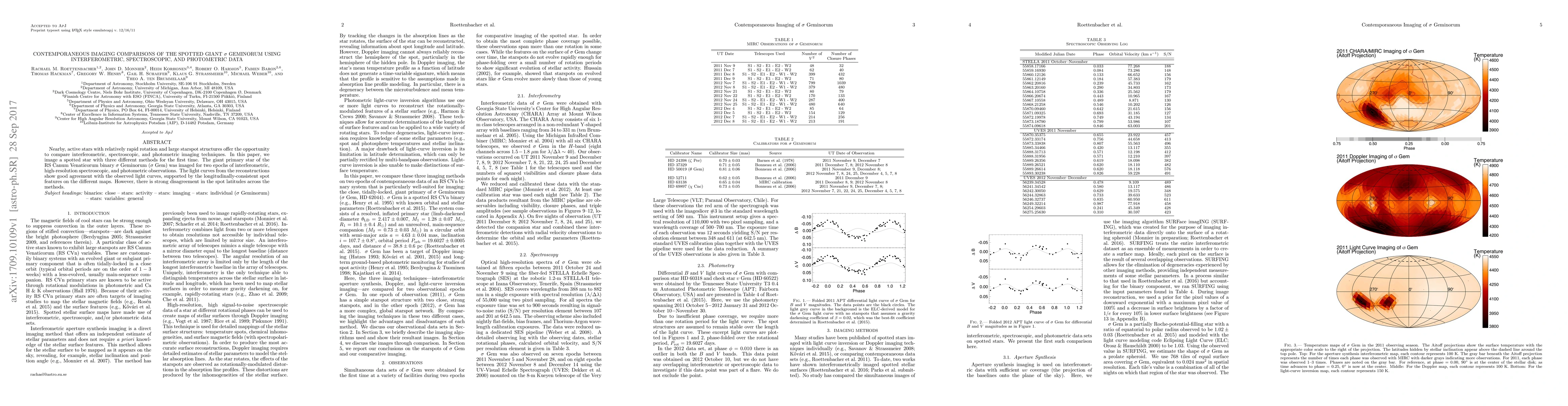 This paper compares interferometric, spectroscopic, and photometric imaging techniques on the spotted giant star $\sigma$ Geminorum. While the reconstructed light curves align well, there is significant inconsistency in the latitude of the star spots across the different imaging methods.