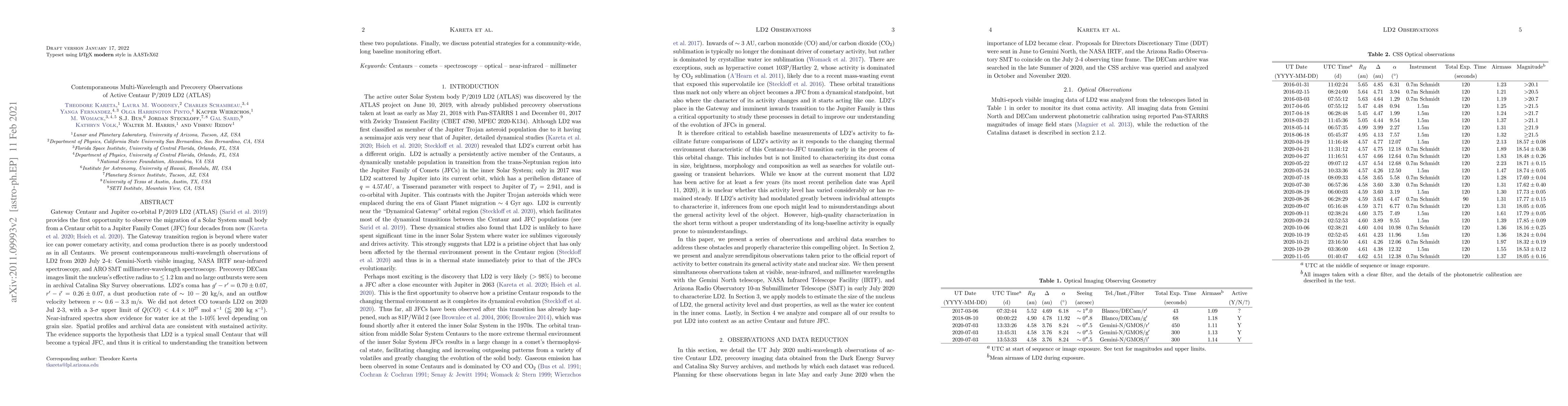 Gateway Centaur and Jupiter co-orbital P/2019 LD2 (ATLAS) (Sarid et al. 2019) provides the first opportunity to observe the migration of a Solar System small body from a Centaur orbit to a Jupiter Family Comet (JFC) four decades from now (Kareta et al., 2020; Hsieh et al. 2020). The Gateway transition region is beyond where water ice can power cometary activity, and coma production there is as poorly understood as in all Centaurs. We present contemporaneous multi-wavelength observations of LD2 from 2020 July 2-4: Gemini-North visible imaging, NASA IRTF near-infrared spectroscopy, and ARO SMT millimeter-wavelength spectroscopy. Precovery DECam images limit the nucleu's effective radius to <=1.2 km and no large outbursts were seen in archival Catalina Sky Survey observations. LD2's coma has g'-r'=0.70+/-0.07, r'-i'=0.26+/-0.07, a dust production rate of ~10-20 kg/s, and an outflow velocity between v~0.6-3.3 m/s. We did not detect CO towards LD2 on 2020 July 2-3, with a 3-sigma upper limit of Q(CO) < 4.4 * 10^27 mol/s (<200 kg/s). Near-infrared spectra show evidence for water ice at the 1-10% level depending on grain size. Spatial profiles and archival data are consistent with sustained activity. The evidence supports the hypothesis that LD2 is a typical small Centaur that will become a typical JFC, and thus it is critical to understanding the transition between these two populations. Finally, we discuss potential strategies for a community-wide, long baseline monitoring effort.