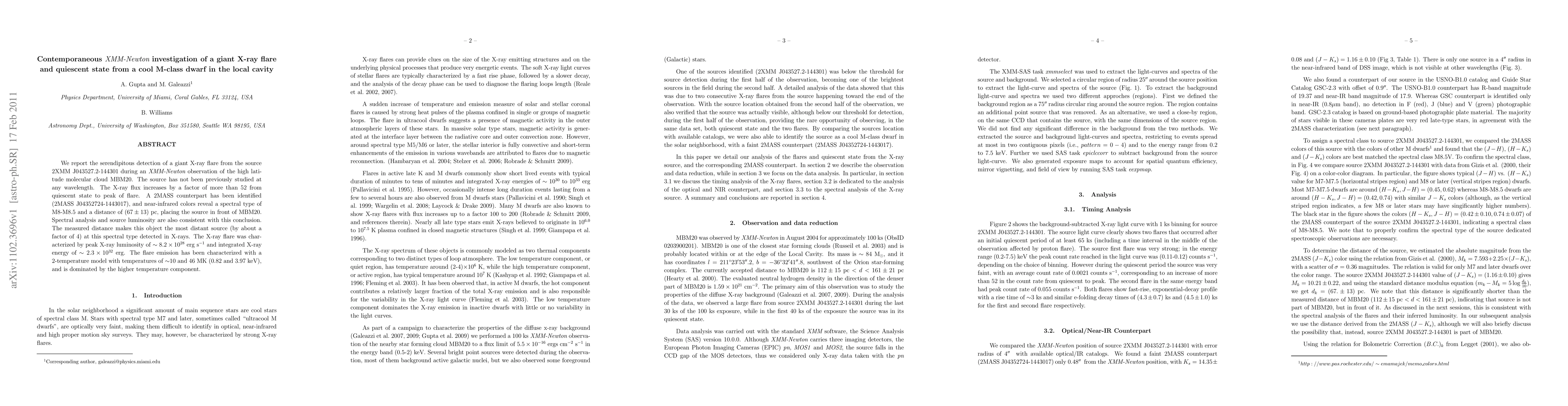 We report the serendipitous detection of a giant X-ray flare from the source 2XMM J043527.2-144301 during an XMM-Newton observation of the high latitude molecular cloud MBM20. The source has not been previously studied at any wavelength. The X-ray flux increases by a factor of more than 52 from quiescent state to peak of flare. A 2MASS counterpart has been identified (2MASS J04352724-1443017), and near-infrared colors reveal a spectral type of M8-M8.5 and a distance of (67\pm 13) pc, placing the source in front of MBM20. Spectral analysis and source luminosity are also consistent with this conclusion. The measured distance makes this object the most distant source (by about a factor of 4) at this spectral type detected in X-rays. The X-ray flare was characterized by peak X-ray luminosity of ~8.2E28 erg s-1 and integrated X-ray energy of ~2.3E32 erg. The flare emission has been characterized with a 2-temperature model with temperatures of ~10 and 46 MK (0.82 and 3.97 keV), and is dominated by the higher temperature component.