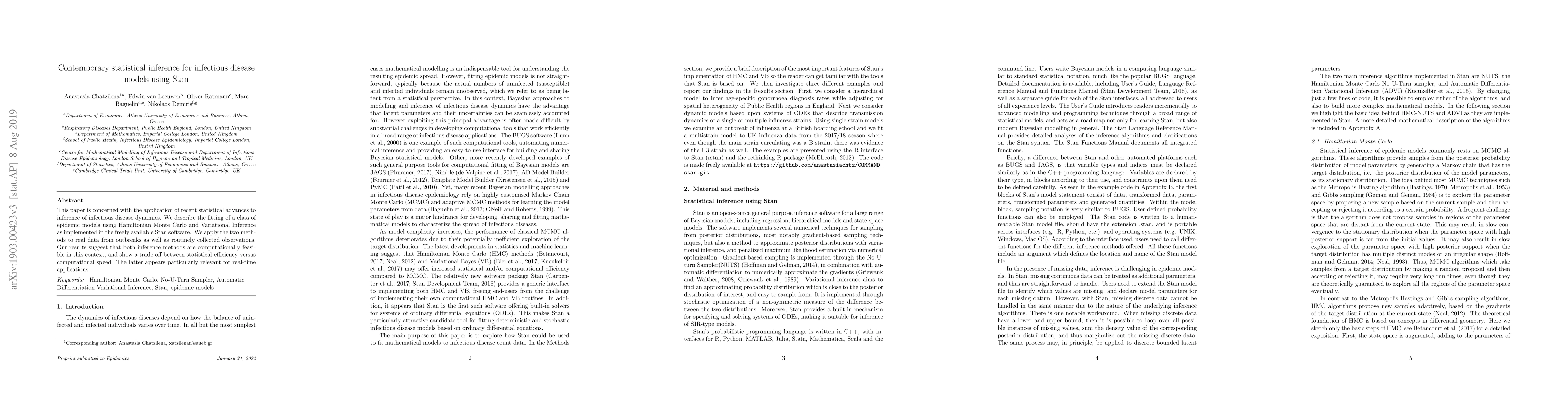 This paper is concerned with the application of recent statistical advances to inference of infectious disease dynamics. We describe the fitting of a class of epidemic models using Hamiltonian Monte Carlo and Variational Inference as implemented in the freely available Stan software. We apply the two methods to real data from outbreaks as well as routinely collected observations. Our results suggest that both inference methods are computationally feasible in this context, and show a trade-off between statistical efficiency versus computational speed. The latter appears particularly relevant for real-time applications.