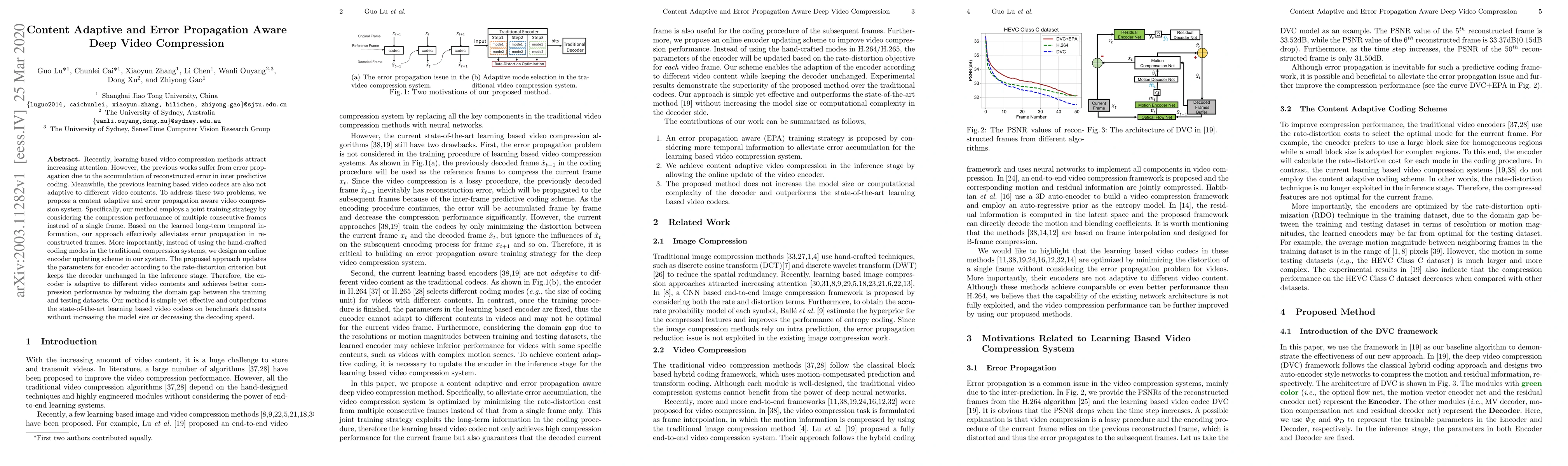 This paper proposes a content adaptive and error propagation aware deep video compression system that employs joint training across multiple frames to mitigate error accumulation. It introduces an online encoder updating scheme that adapts to different video contents, achieving better compression performance without increasing model size or decoding speed.