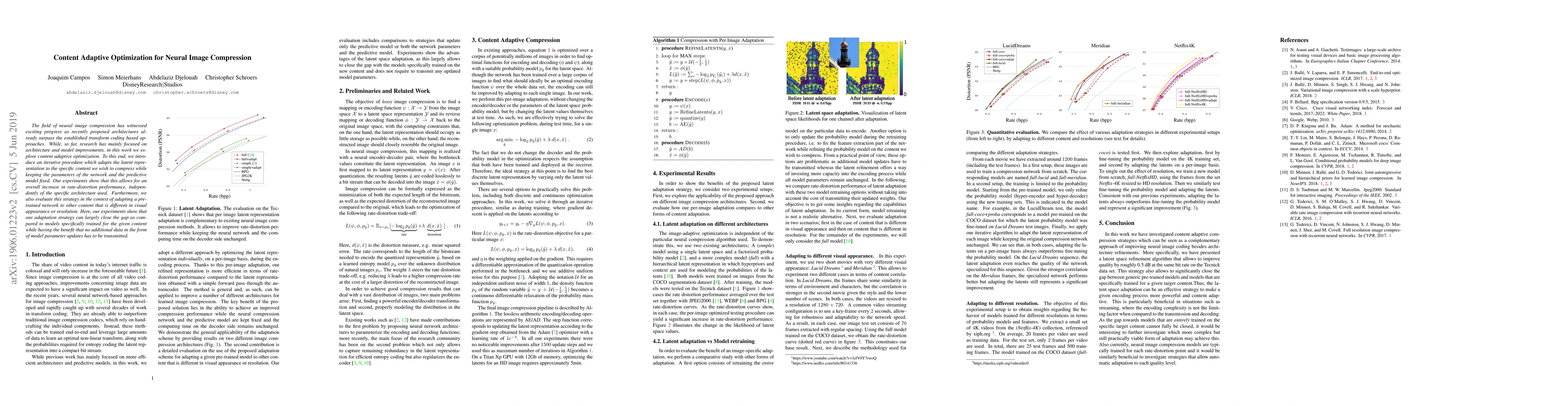 This paper proposes a content adaptive optimization technique for neural image compression that iteratively adjusts the latent representation to specific content without altering network parameters. This method enhances rate-distortion performance across various architectures and effectively adapts pretrained networks to different visual content without requiring additional data updates.