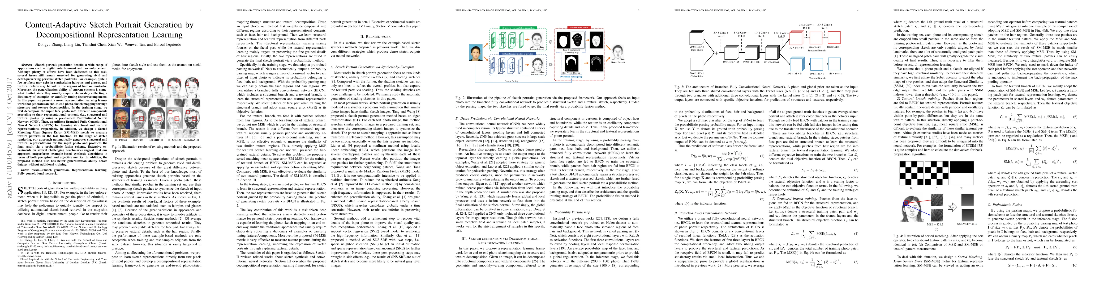 This paper introduces a novel representation learning framework for generating vivid and detail-preserving sketch portraits by decomposing input face photos into structural and textural components using a CNN and BFCN. The proposed SM-MSE metric enhances texture pattern learning, leading to superior results compared to example-based methods, with better generalization across datasets.