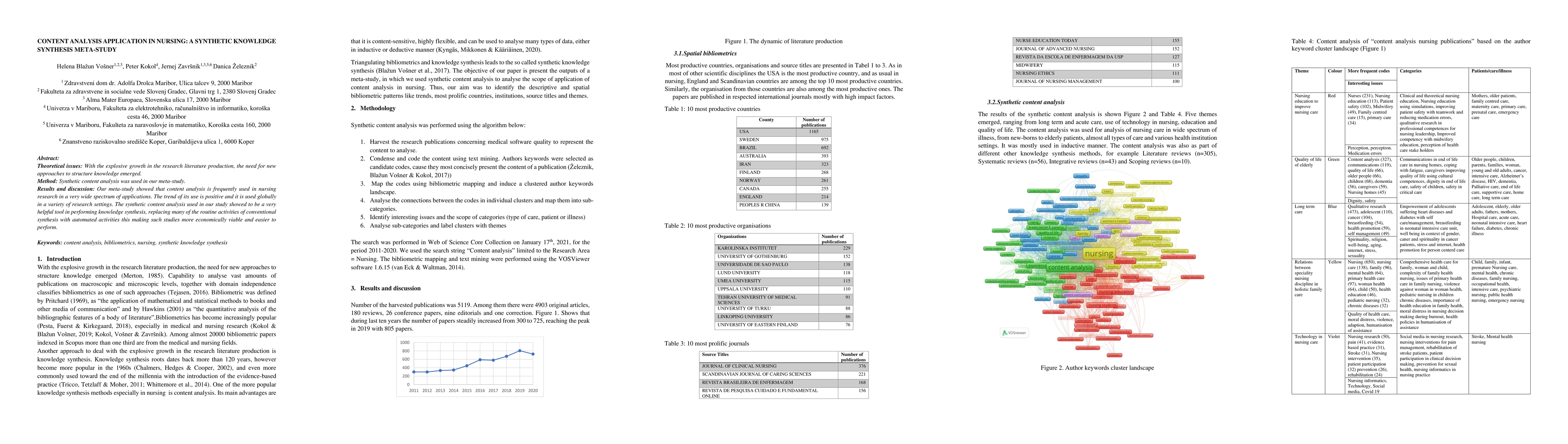 Theoretical issues: With the explosive growth in the research literature production, the need for new approaches to structure knowledge emerged. Method: Synthetic content analysis was used in our meta-study. Results and discussion: Our meta-study showed that content analysis is frequently used in nursing research in a very wide spectrum of applications. The trend of its use is positive and it is used globally in a variety of research settings. The synthetic content analysis used in our study showed to be a very helpful tool in performing knowledge synthesis, replacing many of the routine activities of conventional synthesis with automated activities this making such studies more economically viable and easier to perform.