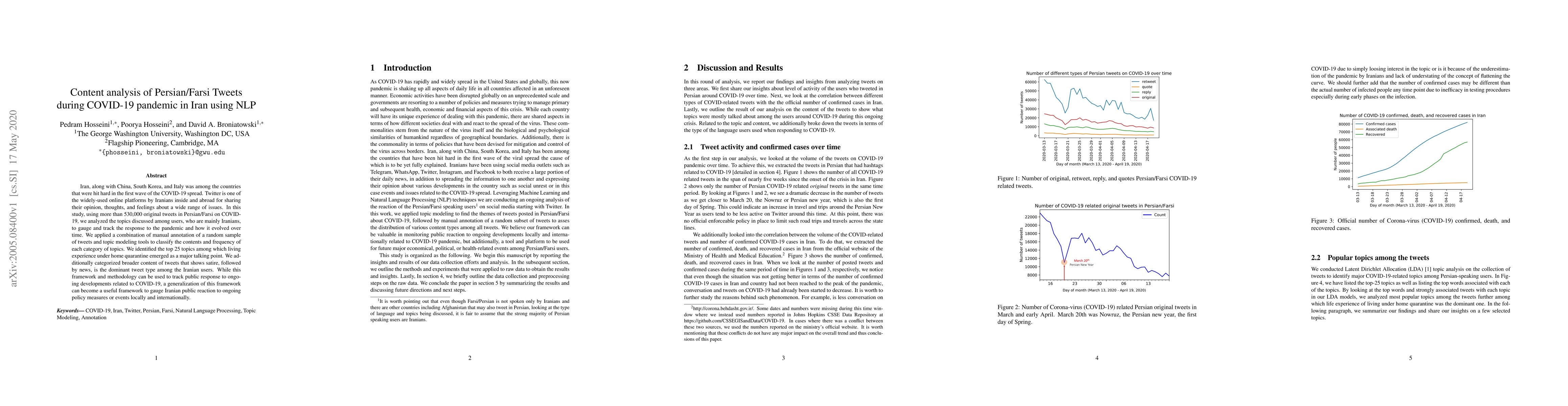 This study analyzes over 530,000 Persian/Farsi COVID-19 tweets to identify and track topics discussed by Iranian users, revealing home quarantine experiences and satire as major themes. The research combines manual annotation and topic modeling for classification.