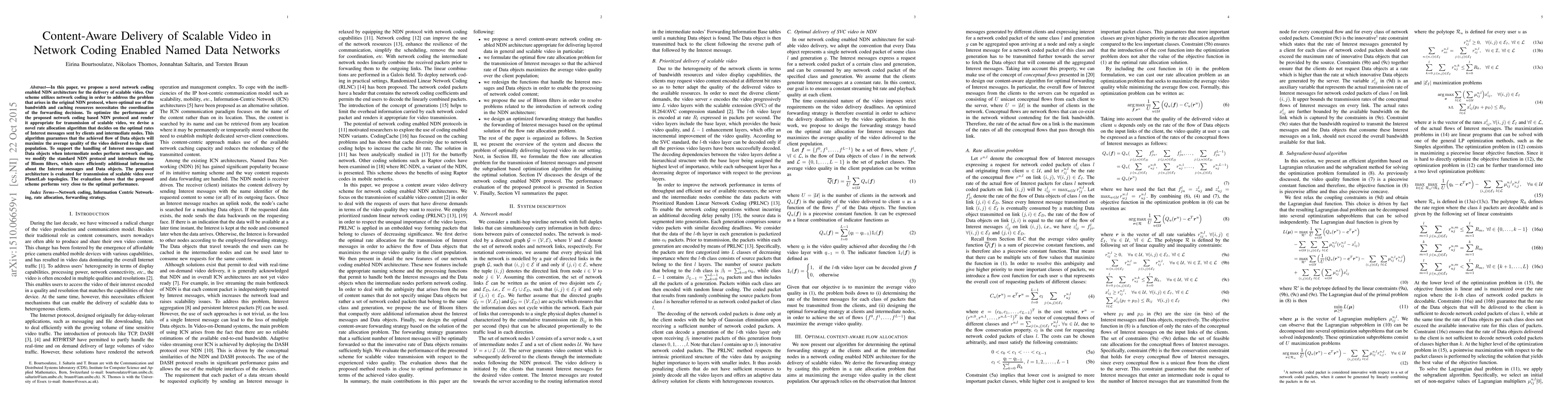 This paper proposes a network coding enabled NDN architecture for scalable video delivery, addressing bandwidth and caching coordination issues. It introduces a novel rate allocation algorithm and modifies the NDN protocol with Bloom filters to optimize video quality, achieving near-optimal performance in PlanetLab evaluations.