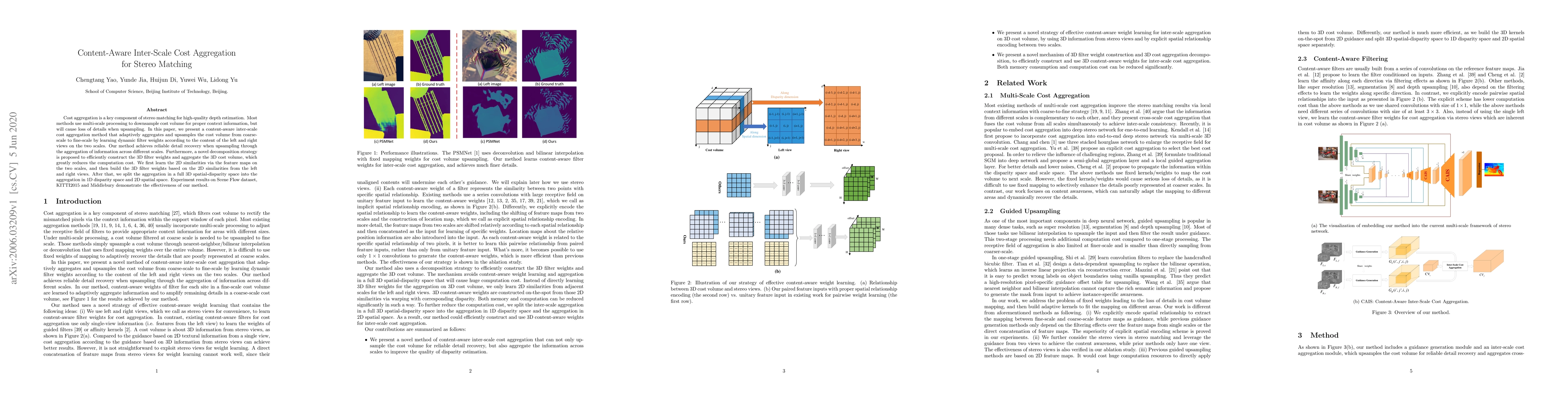 This paper introduces a content-aware inter-scale cost aggregation method for stereo matching that adaptively aggregates and upsamples cost volumes using dynamic filter weights learned from the content of left and right views. The proposed decomposition strategy efficiently constructs 3D filter weights and reduces computation costs, achieving reliable detail recovery and outperforming existing methods on benchmark datasets.