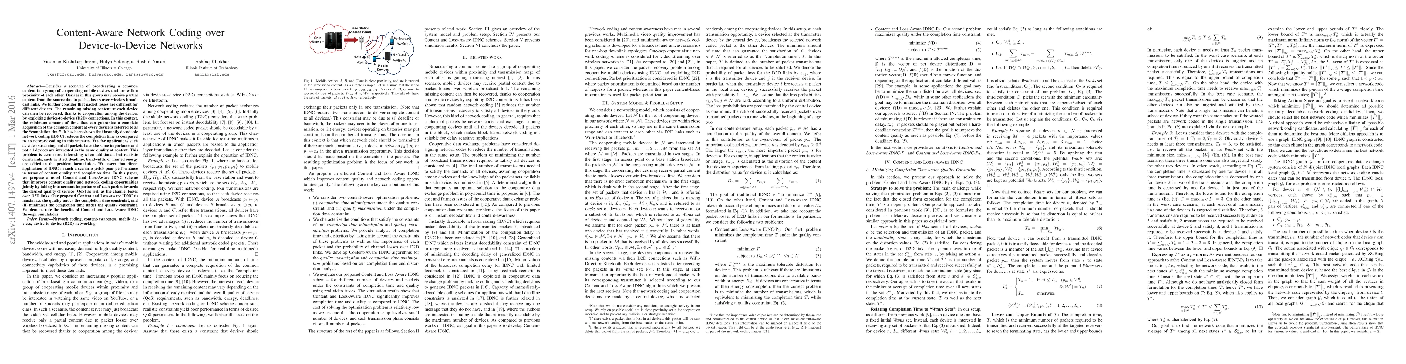 This paper proposes a novel Content and Loss-Aware Instantaneously Decodable Network Coding (IDNC) scheme for device-to-device networks to improve content quality and reduce completion time, addressing varying packet importance and realistic constraints. The proposed scheme maximizes quality under time constraints and minimizes time under quality constraints, demonstrated through simulations.