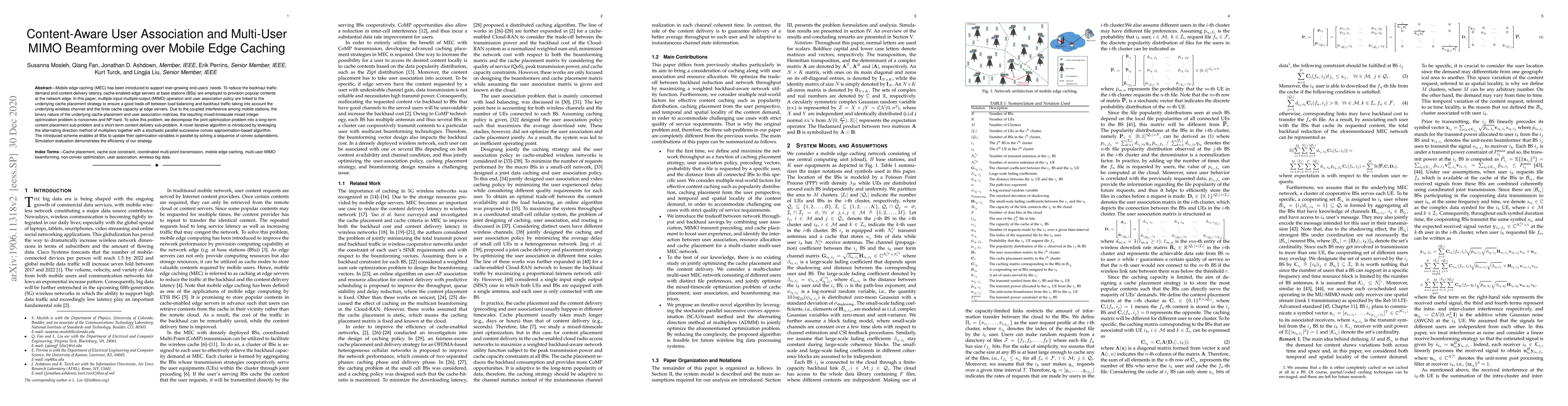 This paper explores a strategy for optimizing content-aware user association and multi-user MIMO beamforming in mobile edge caching systems to balance load and reduce backhaul traffic. It introduces an iterative algorithm combining the alternating direction method of multipliers and stochastic parallel convex approximation to solve a complex mixed-integer optimization problem, demonstrating improved efficiency through simulations.