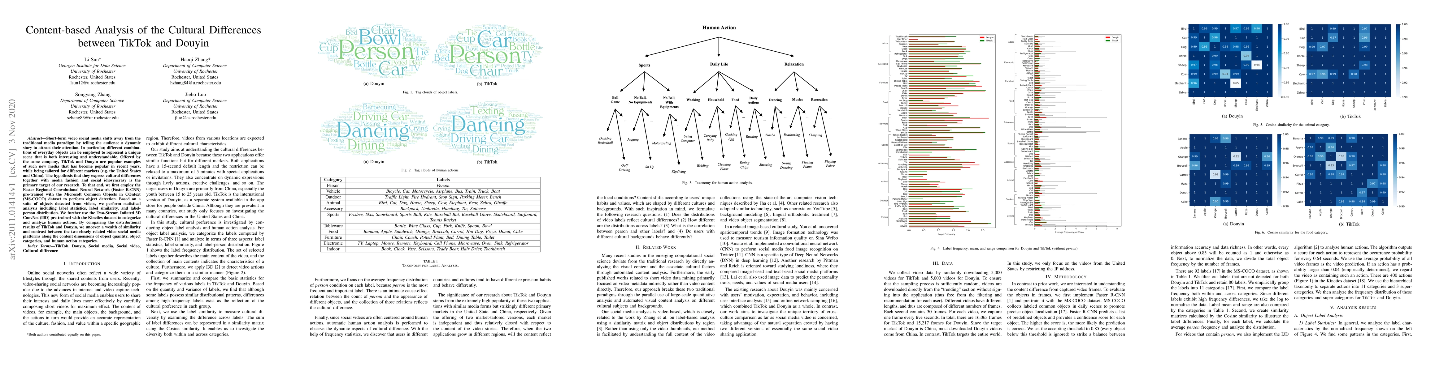 Short-form video social media shifts away from the traditional media paradigm by telling the audience a dynamic story to attract their attention. In particular, different combinations of everyday objects can be employed to represent a unique scene that is both interesting and understandable. Offered by the same company, TikTok and Douyin are popular examples of such new media that has become popular in recent years, while being tailored for different markets (e.g. the United States and China). The hypothesis that they express cultural differences together with media fashion and social idiosyncrasy is the primary target of our research. To that end, we first employ the Faster Regional Convolutional Neural Network (Faster R-CNN) pre-trained with the Microsoft Common Objects in COntext (MS-COCO) dataset to perform object detection. Based on a suite of objects detected from videos, we perform statistical analysis including label statistics, label similarity, and label-person distribution. We further use the Two-Stream Inflated 3D ConvNet (I3D) pre-trained with the Kinetics dataset to categorize and analyze human actions. By comparing the distributional results of TikTok and Douyin, we uncover a wealth of similarity and contrast between the two closely related video social media platforms along the content dimensions of object quantity, object categories, and human action categories.