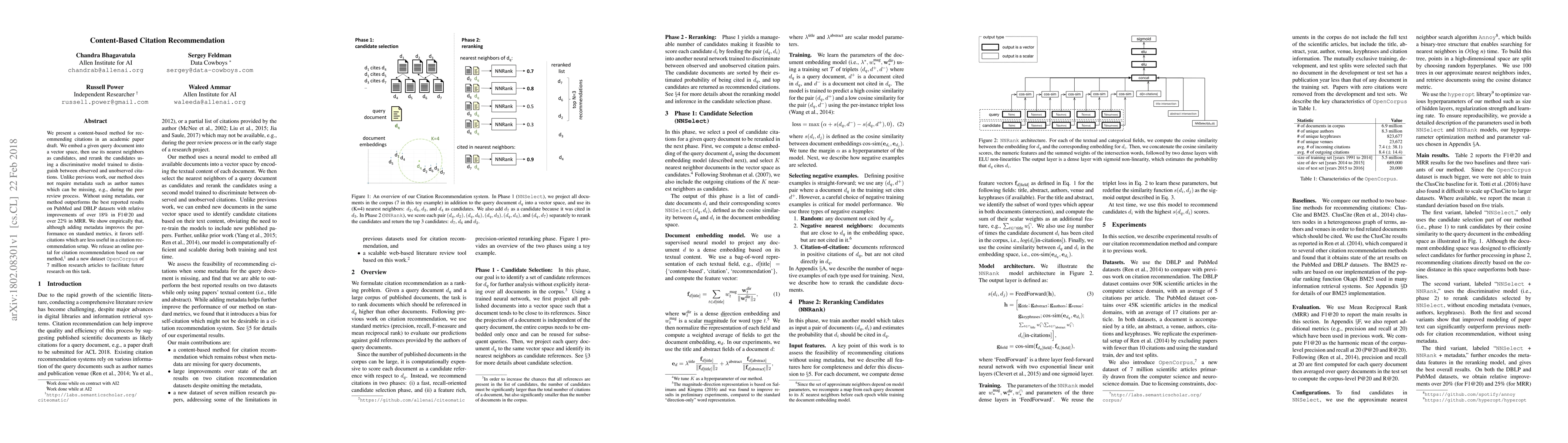 We present a content-based method for recommending citations in an academic paper draft. We embed a given query document into a vector space, then use its nearest neighbors as candidates, and rerank the candidates using a discriminative model trained to distinguish between observed and unobserved citations. Unlike previous work, our method does not require metadata such as author names which can be missing, e.g., during the peer review process. Without using metadata, our method outperforms the best reported results on PubMed and DBLP datasets with relative improvements of over 18% in F1@20 and over 22% in MRR. We show empirically that, although adding metadata improves the performance on standard metrics, it favors self-citations which are less useful in a citation recommendation setup. We release an online portal (http://labs.semanticscholar.org/citeomatic/) for citation recommendation based on our method, and a new dataset OpenCorpus of 7 million research articles to facilitate future research on this task.