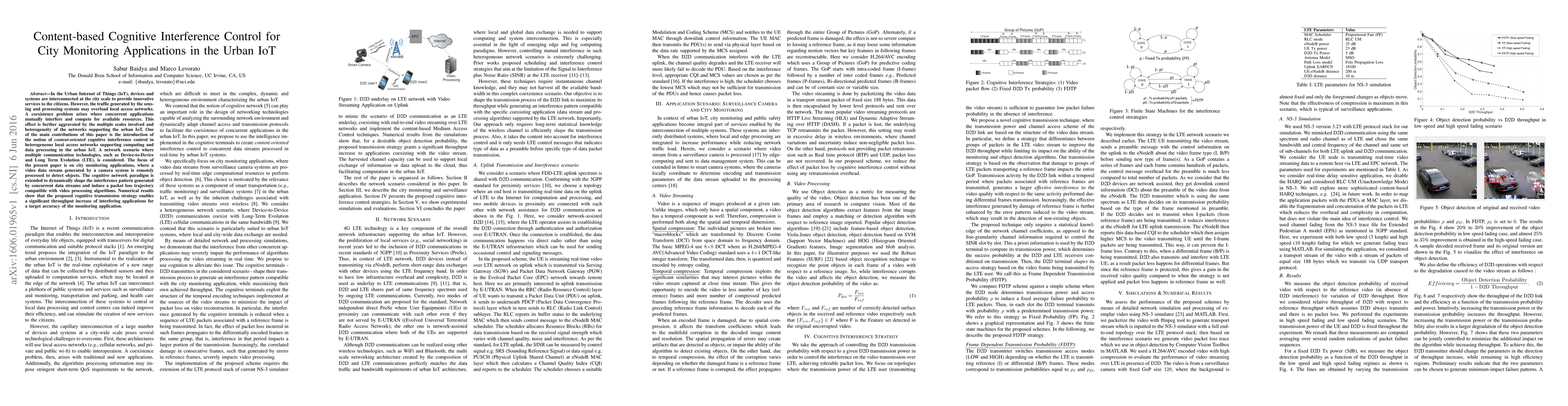 In the Urban Internet of Things devices and systems are interconnected at the city scale to provide innovative services to the citizens.However, the traffic generated by the sensing and processing systems may overload local access networks. A coexistence problem arises where concurrent applications mutually interfere and compete for available resources. This effect is further aggravated by the multiple scales involved and heterogeneity of the networks supporting the urban IoT. One of the main contributions of this paper is the introduction of the notion of content-oriented cognitive interference control in heterogeneous local access networks supporting computing and data processing in the urban IoT. A network scenario where multiple communication technologies, such as Device-to-Device and Long Term Evolution (LTE), is considered. The focus of the present paper is on city monitoring applications, where a video data stream generated by a camera system is remotely processed to detect objects. The cognitive network paradigm is extended to dynamically shape the interference pattern generated by concurrent data streams and induce a packet loss trajectory compatible with video processing algorithms. Numerical results show that the proposed cognitive transmission strategy enables a significant throughput increase of interfering applications for a target accuracy of the monitoring application.