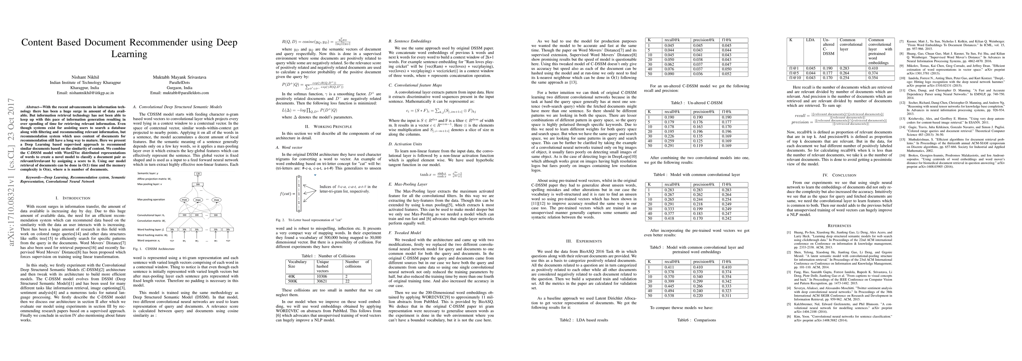 This paper proposes a deep learning-based approach to recommend similar documents based on their content using a novel model that combines C-DSSM with Word2Vec distributed representations. It enables fast document retrieval in O(1) time and low memory complexity of O(n).