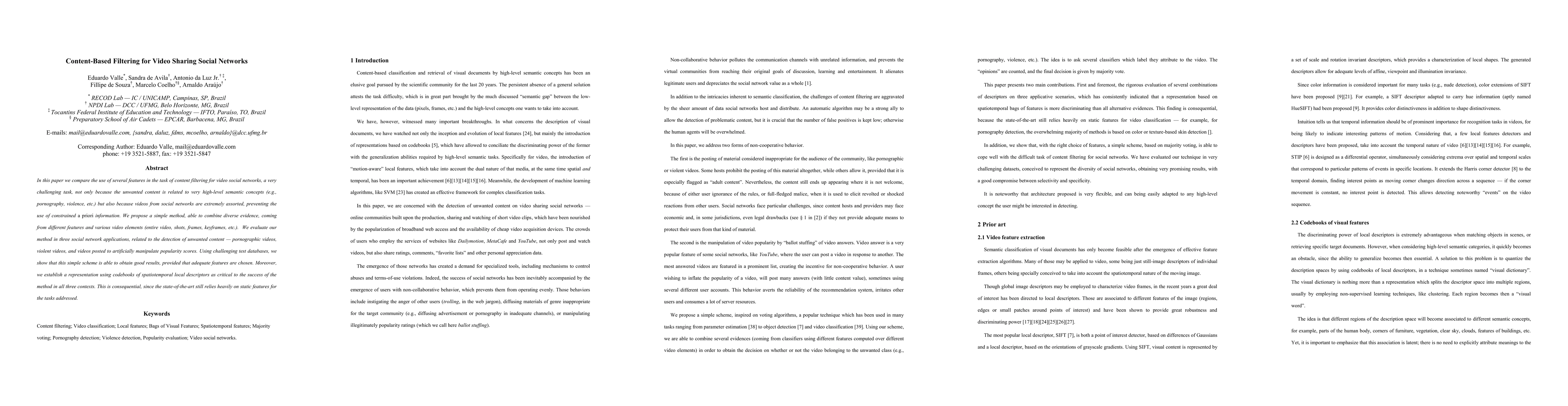 This paper proposes a content-based filtering method for video social networks that combines diverse features from various video elements to detect unwanted content. The method uses spatiotemporal local descriptors in codebooks, achieving good results in detecting pornography, violence, and manipulated popularity videos, outperforming static feature reliance.